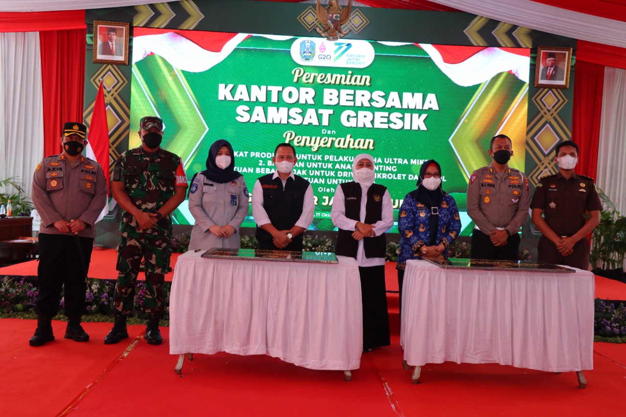 Peresmian kantor bersama Samsat Gresik diawali dengan penyerahan berbagai bantuan kepada masyarakat Gresik. Bantuan tersebut diserahkan langsung Gubernur Khofifah Indar Parawansa diantaranya zakat produktif untuk pelaku usaha ultra mikro, bantuan untuk anak stunting, bantuan bebas pajak untuk driver mikrolet dan ojek online, serta bantuan untuk ASPD.