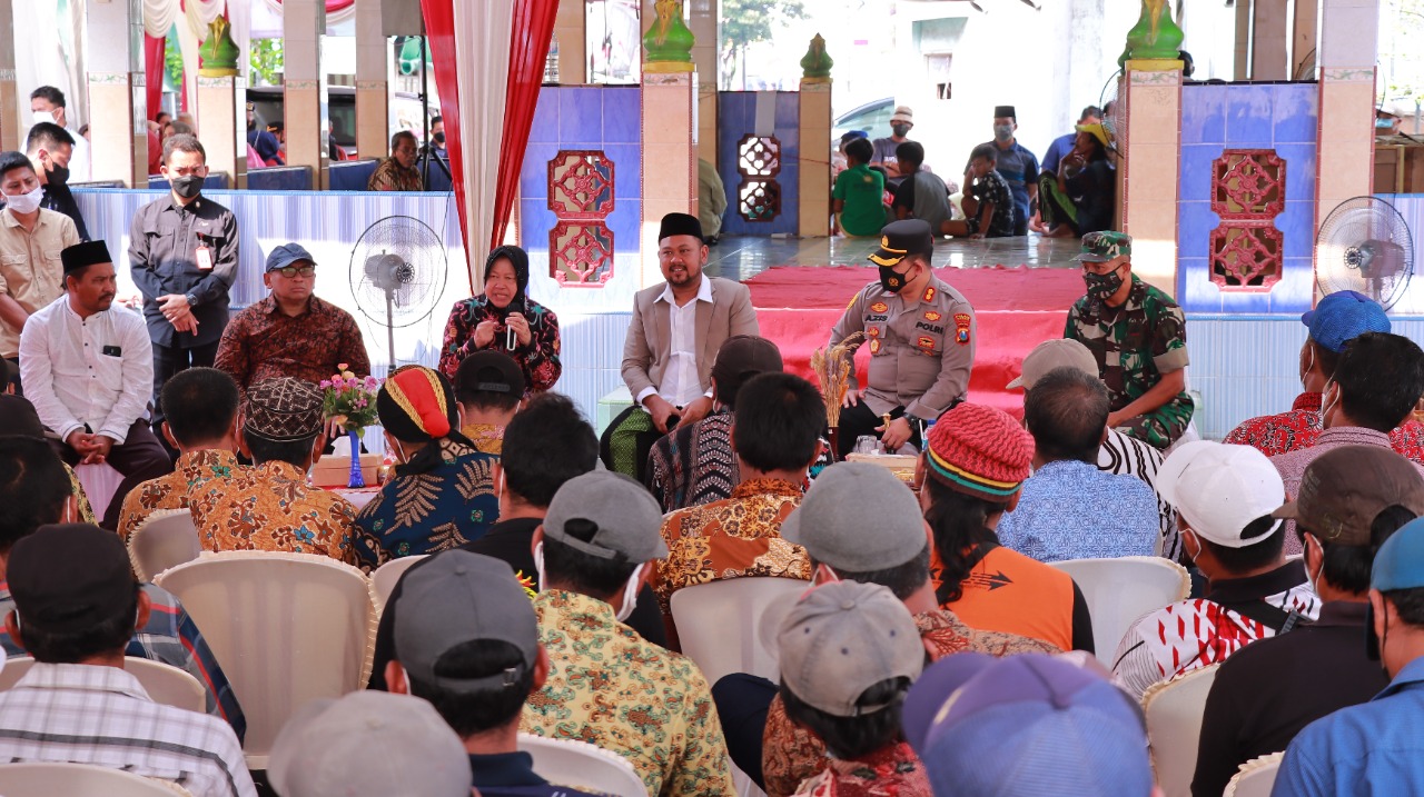 Menteri Sosial Ibu Tri Rismaharini bersama rombongan disambut hangat oleh Forkopimda Kabupaten Gresik di Balai Purbo bersama para nelayan sekitar.