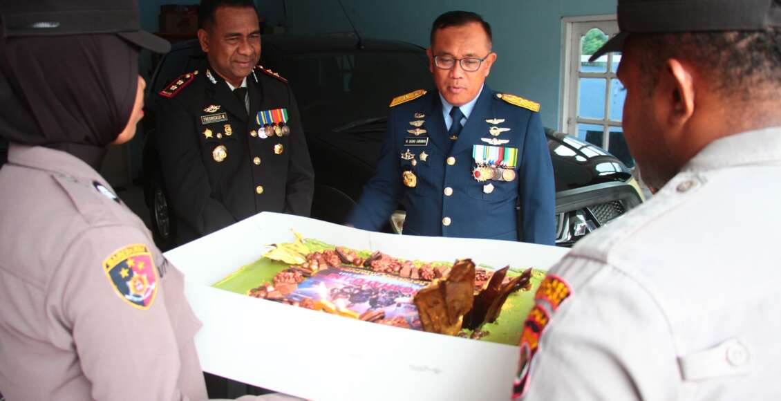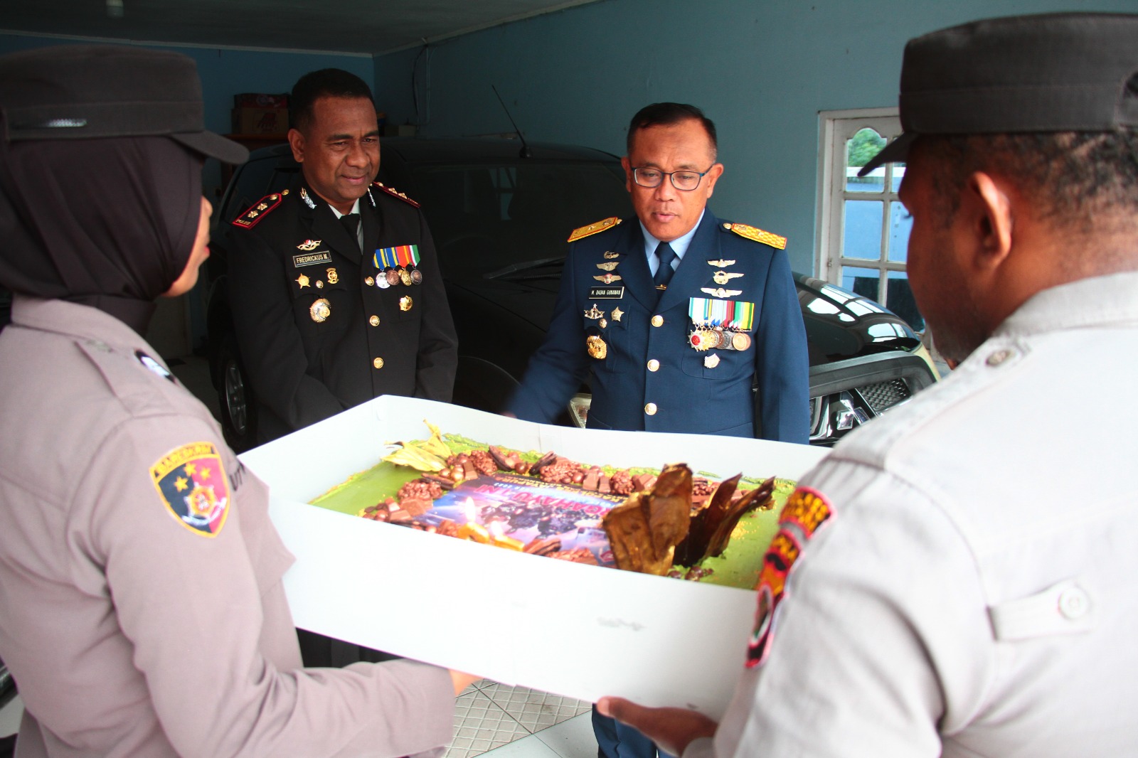 Kapolres Jayapura AKBP Fredrickus W.A Maclarimboen, S.IK., MH tampak bersemangat memberikan ucapan selamat ulang tahun kepada pimpinan dan prajurit TNI.