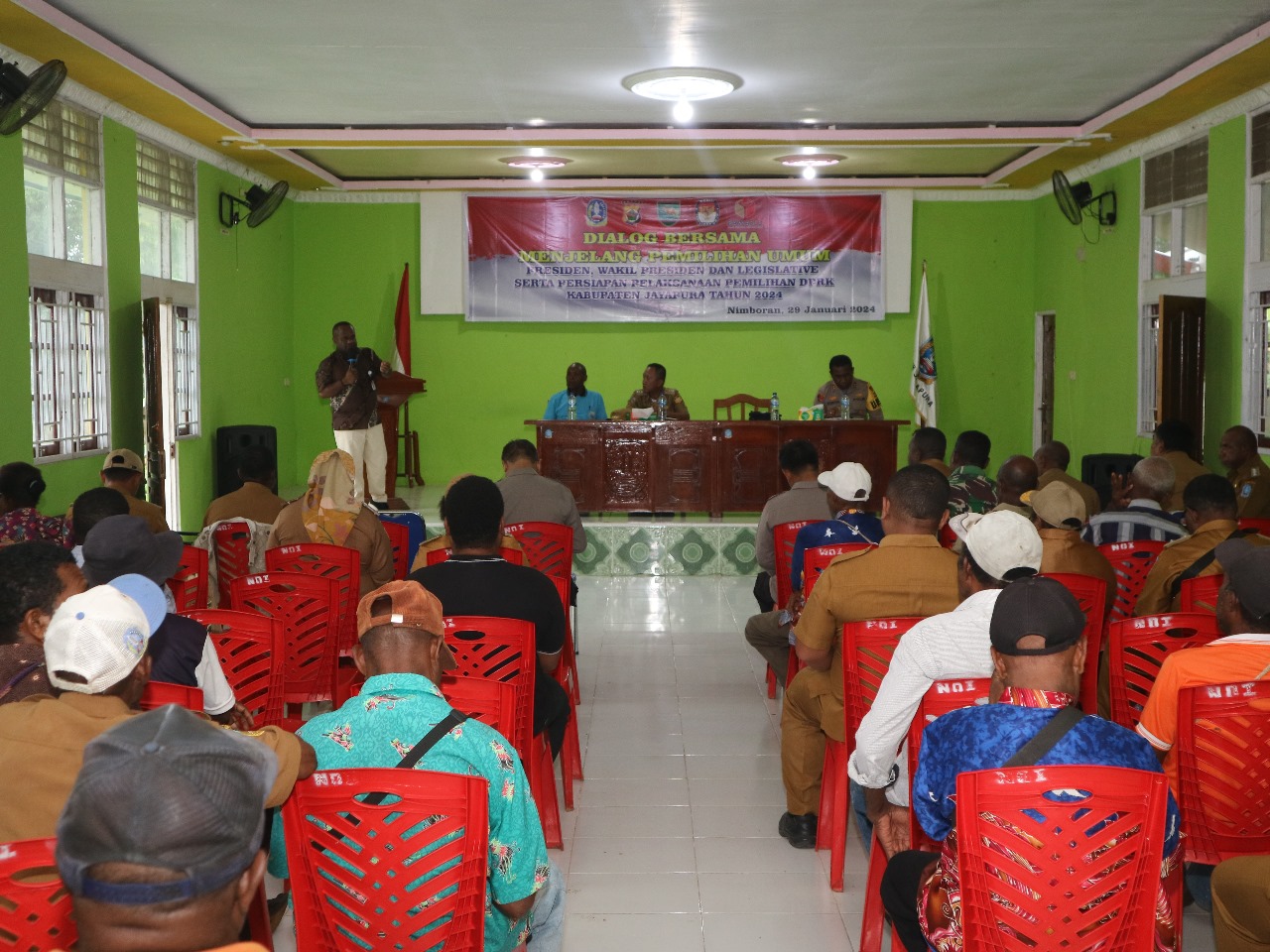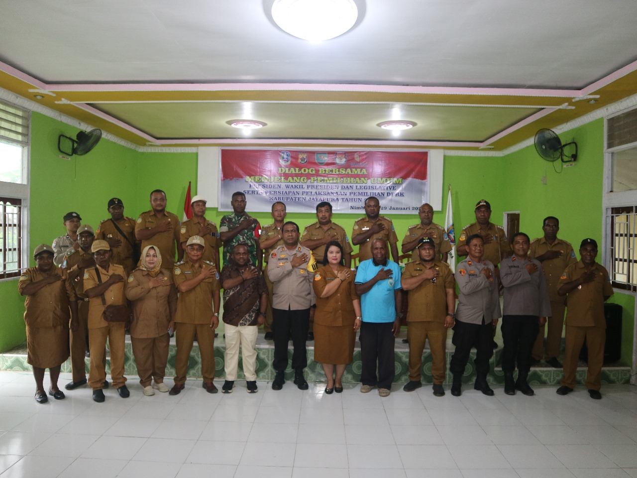 JAYAPURA,ikagawanews.id – Dialog bersama menjelang Pemilihan Umum dengan membahas persiapan pelaksanaan pemilihan umum Presiden, Wakil Presiden dan Legislative serta Persiapan Pelaksanaan Pemilihan DPRK yang berlangsung di Aula Distrik Nimboran Kab. Jayapura