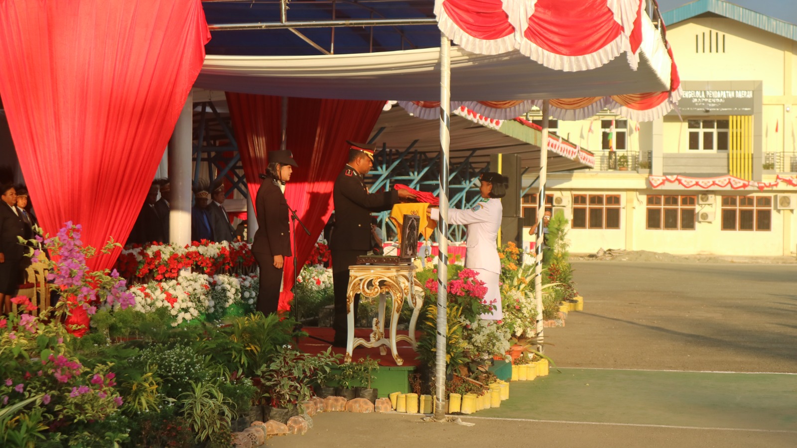 Hadir dalam upacara tersebut Sekda Kab. Jayapura Dr. Hana S. Hikoyabi, S.Pd., MKP, unsur forkopimda Kabupaten Jayapura, para peserta upacara dan tamu undangan serta masyarakat.