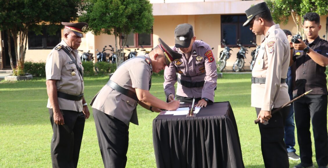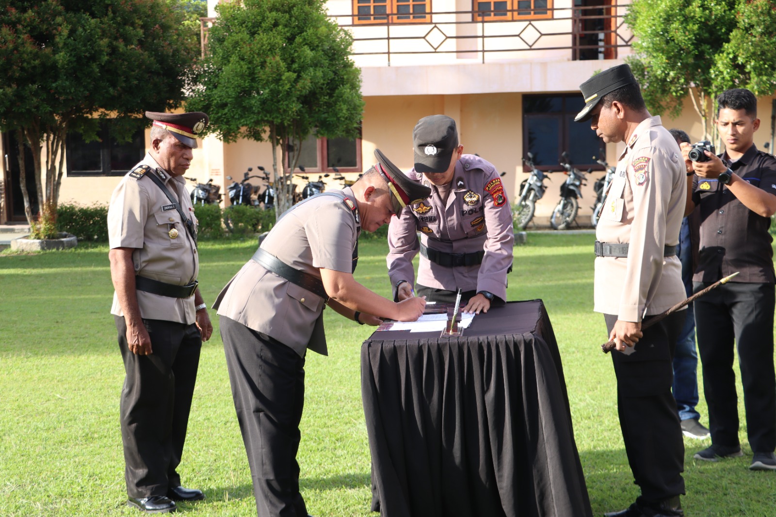 Kapolres Jayapura AKBP Fredrickus W.A Maclarimboen, S.IK.,MH memimpin langsung upacara serah terima jabatan Kasat Reskrim, Kasat Intelkam, Kasat Polair, Kapolsek Sentani Kota dan Kapolsek Sentani Timur yang ditandai dengan pengambilan sumpah janji serta penandatanganan fakta integritas.