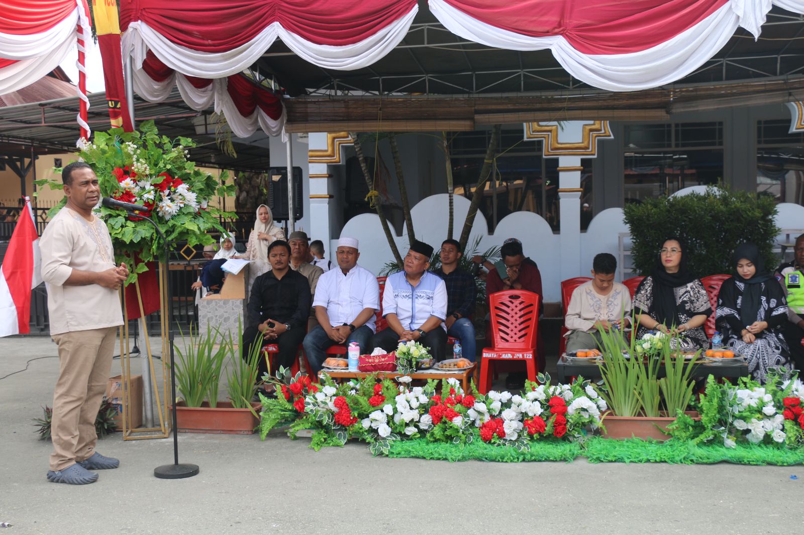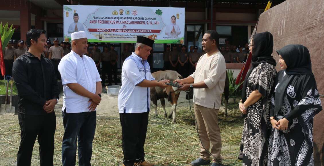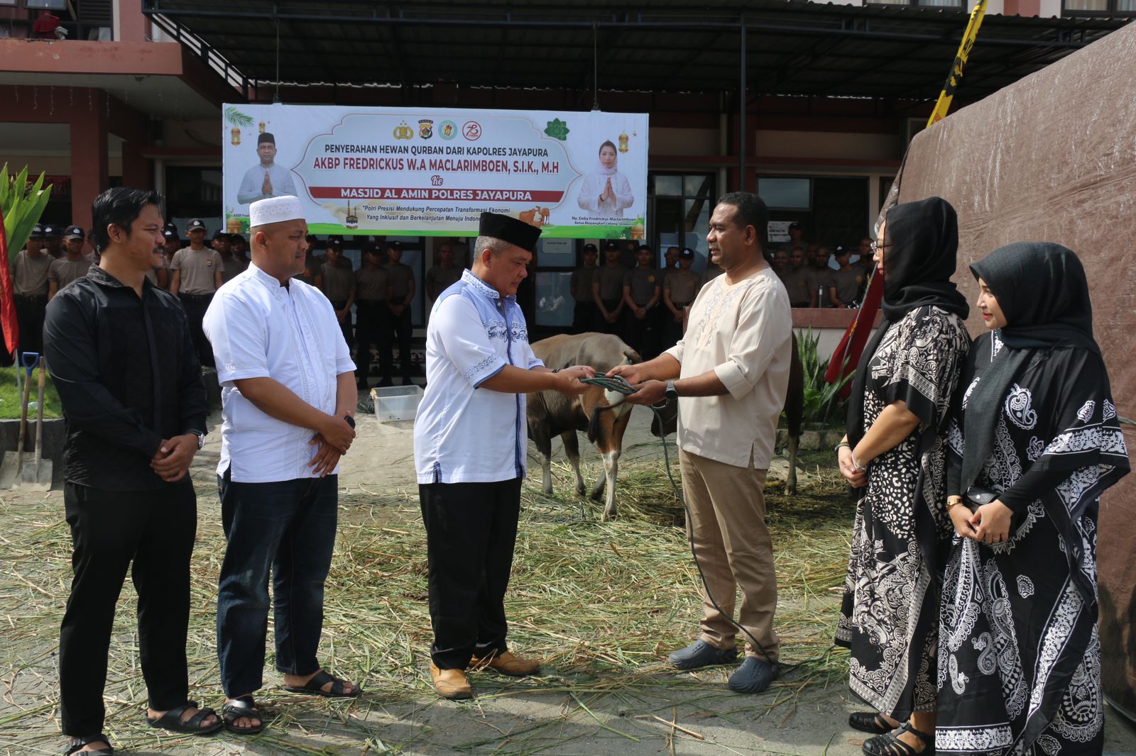 Kapolres Jayapura AKBP Fredrickus W.A Maclarimboen, S.I.K., M.H yang didampingi Ketua Bhayangkari Cabang Jayapura Ny. Deby Fredrickus Maclarimboen secara simbolis menyerahkan satu ekor sapi untuk diqurbankan dan diterima langsung Ketua Panitia hari Raya Idul Adha 1445 H, AKP Rozikin, SH.