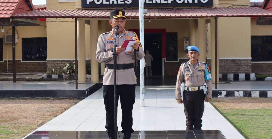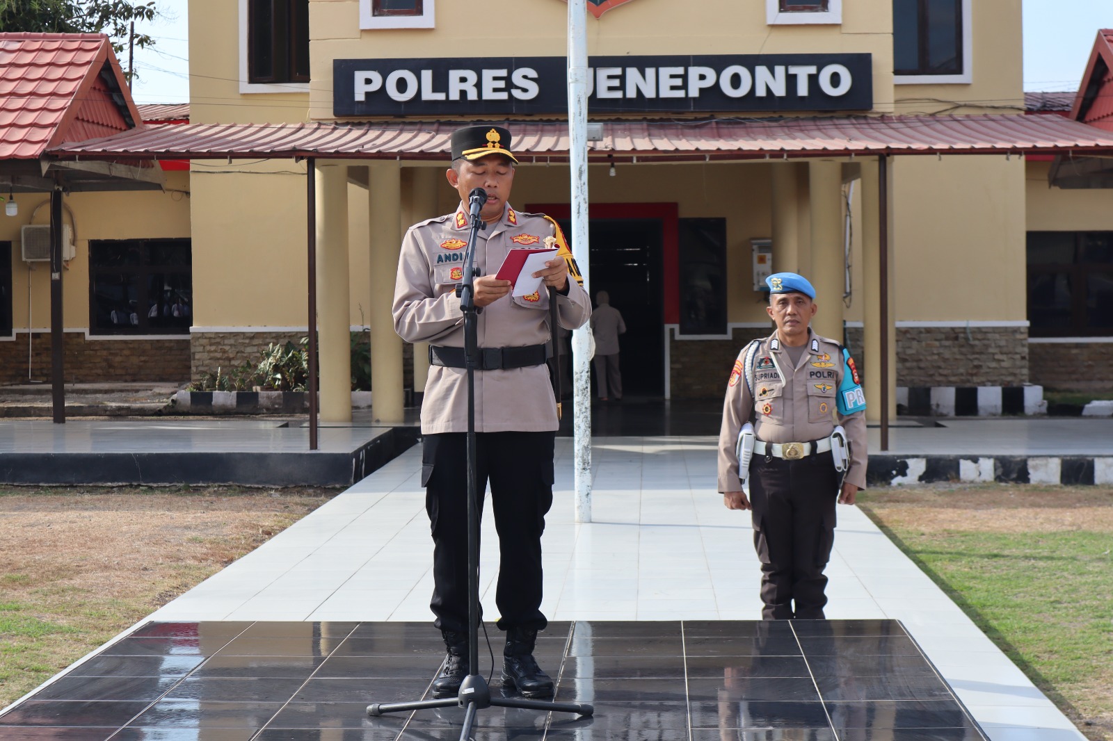Bertindak selaku pimpinan apel Kapolres Jeneponto (AKBP Andi Erma Suryono. SH.,S.Ik) selaku Perwira Apel Kasubag Bin OPS Polres Jeneponto AKP.Salman Salam,SH dan Selaku Komandan Apel Ka SPKT Ipda.Wawan,S.Sos