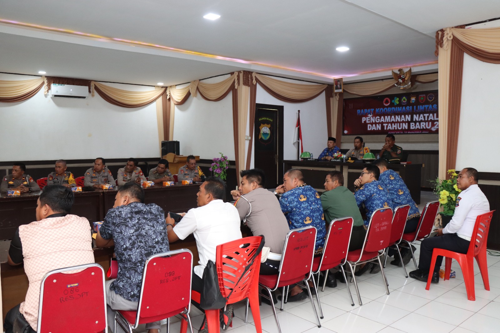 Kegiatan Rapat Koordinasi Lintas Sektoral Ops Lilin 2023 dalam Rangka Pengamanan Natal 2023 dan Tahun Baru 2024 ini dilaksanakan di Aula lantai 2 Mapolres Jeneponto di Jalan Sultan Hasanuddin No. 66 Kelurahan Empoang Kecamatan Binamu Kabupaten Jeneponto, Selasa (19/12/23).