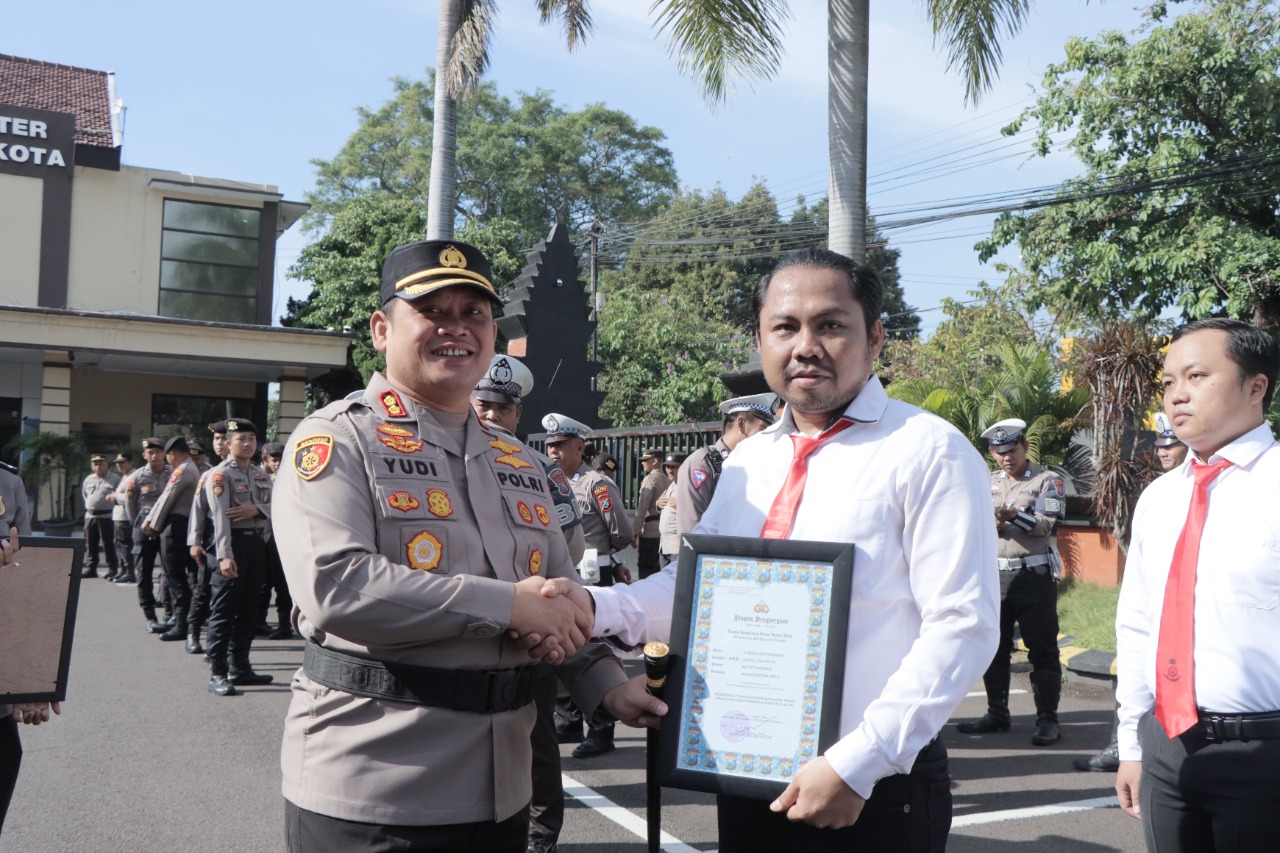 Kapolres Kediri Kota AKBP Wahyudi S.I.K.,M.H. memimpin upacara langsung dan sekaligus memberikan penghargaan kepada anggota yang berprestasi.
