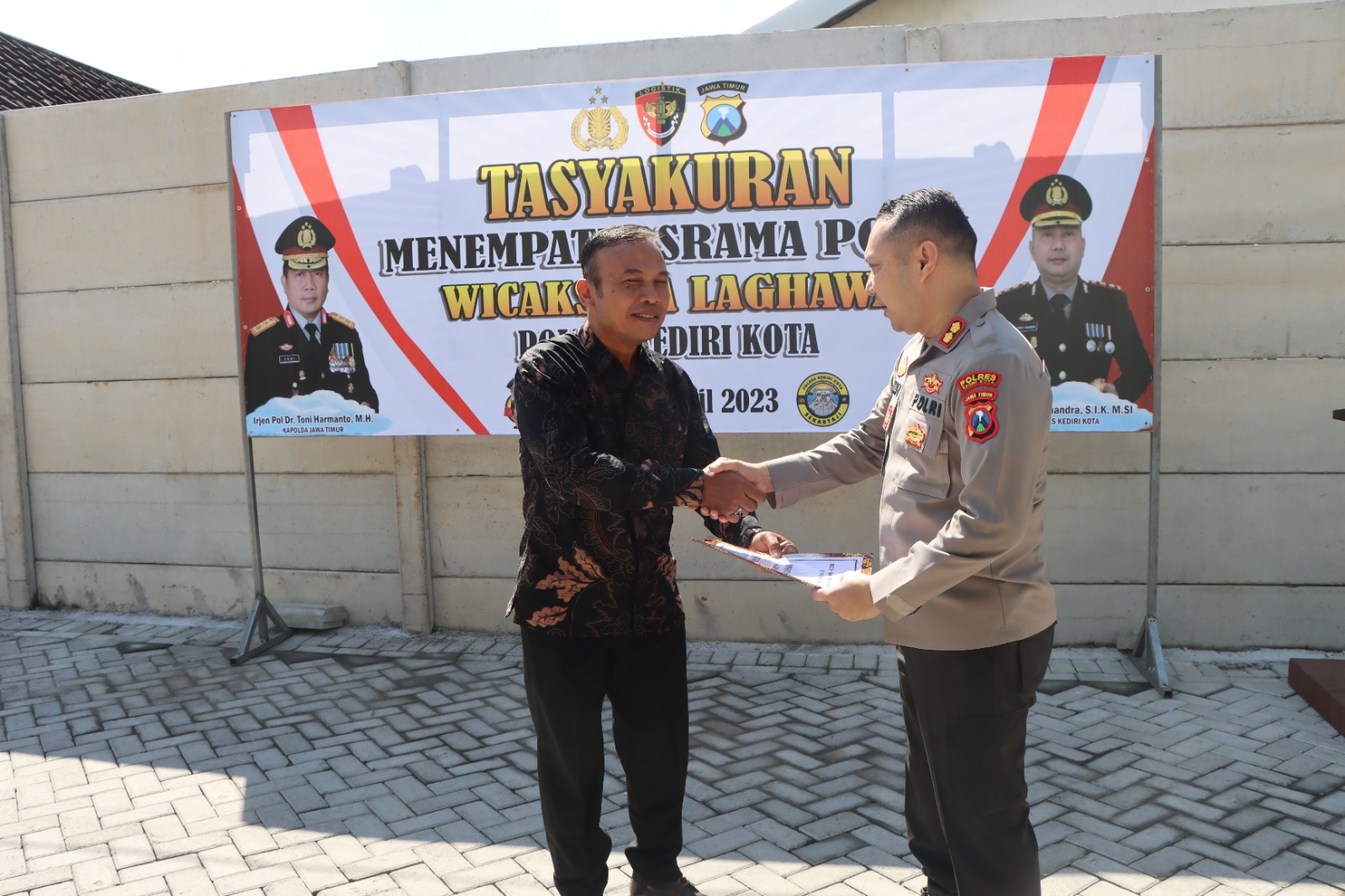 Kapolres Kediri Kota dalam sambutannya mengucapkan terima kasih pada semua pihak yang menyukseskan pembangunan asrama Polri Wicaksana Laghawa yang sangat mendukung pelaksanaan dan kelancaran anggota Polres Kediri Kota dalam memberikan pelayanan Kepolisian kepada masyarakat Kota Kediri.