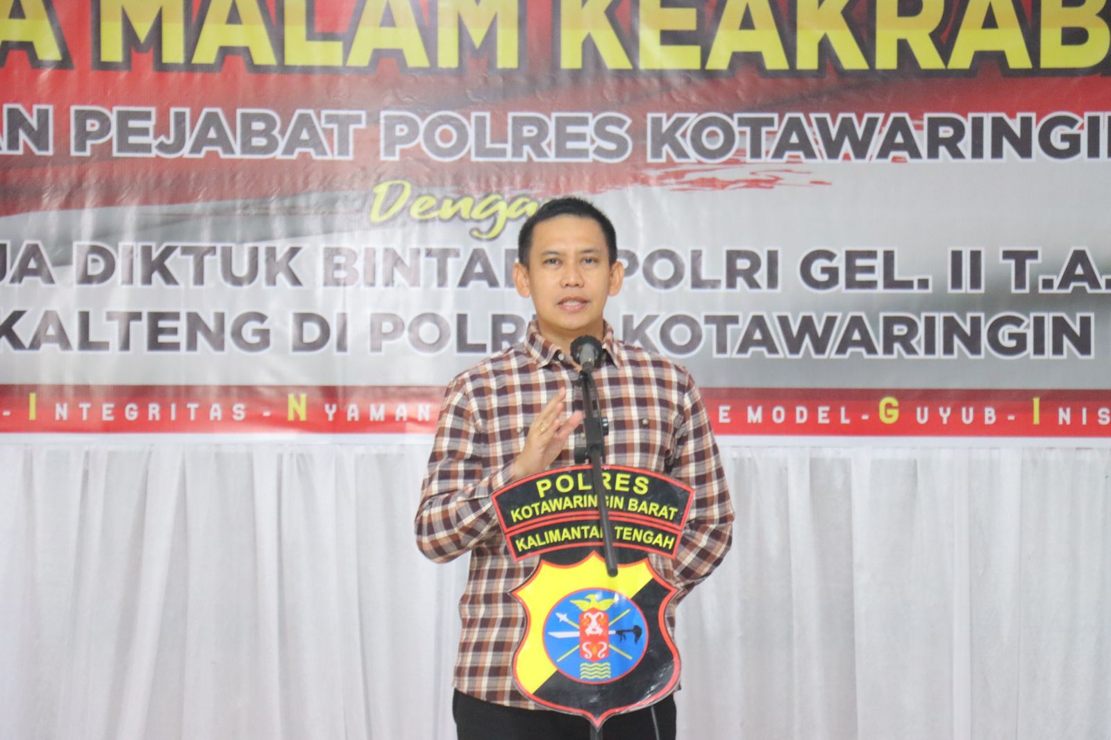 Kapolres Kotawaringin Barat AKBP BAYU WICAKSONO, S.H., S.I.K., M.Si. mengatakan bahwa acara malam keakraban diselenggarakan sebagai bentuk Apresiasi Polres Kotawaringin Barat kepada apara Siswa Diktuk Bintata Polri Gel II T.A 2023 yang telah melaksanakan Latihan Kerja.