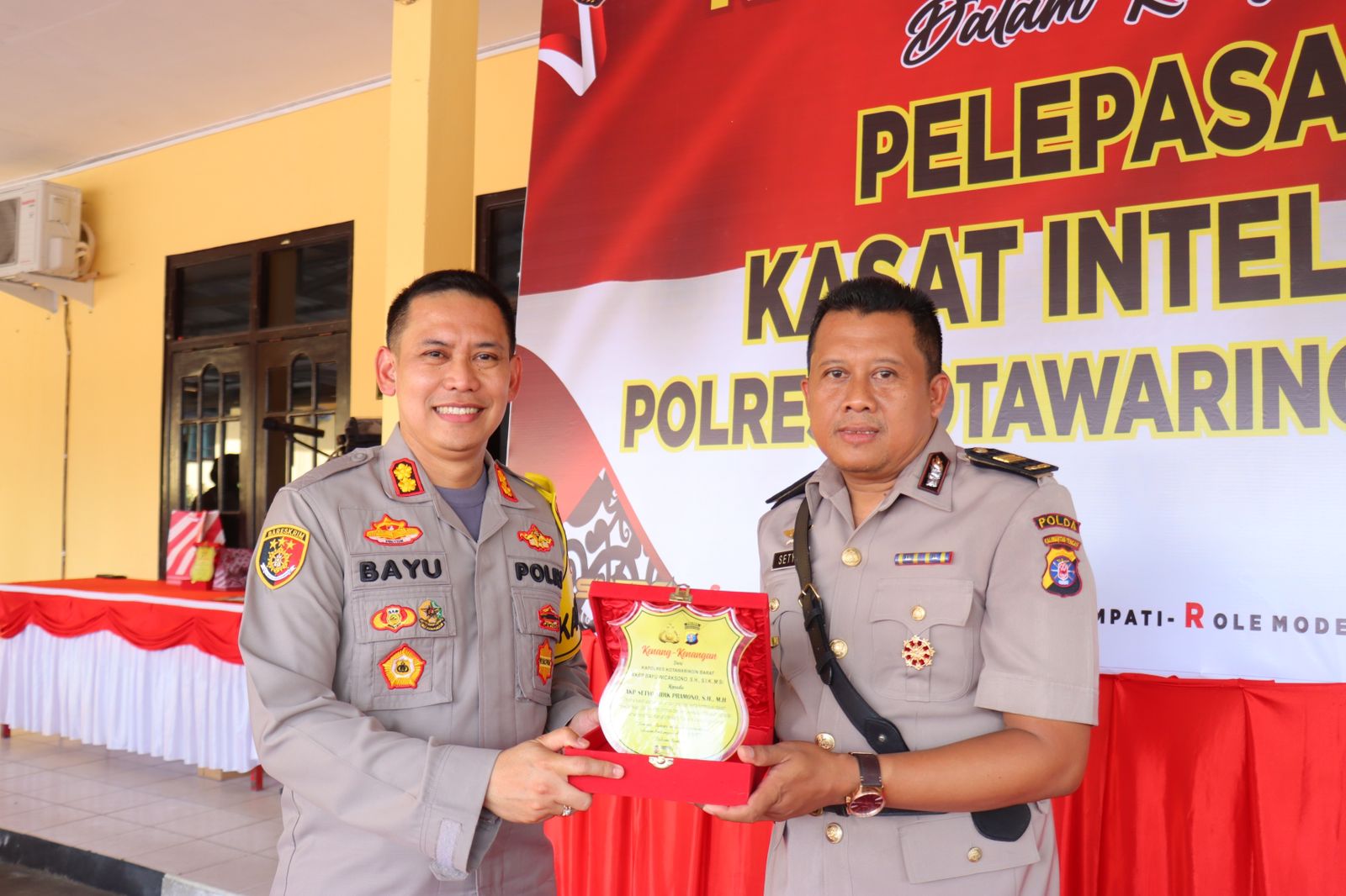 “Dalam kesempatan ini Kapolres Kotawaringin Barat AKBP Bayu Wicaksono, S.H., S.I.K., M.Si. setelah menandatangani surat penyerahan tugas dan tanggung jawab Kasat Intelkam Polres Kotawaringin Barat, memberikan piagam penghargaan kepada AKP Setyo Sidik Pramono, S.H., M.H. atas dedikasinya selama bertugas sebagai Kasat Intelkam Polres Kotawaringin Barat”.