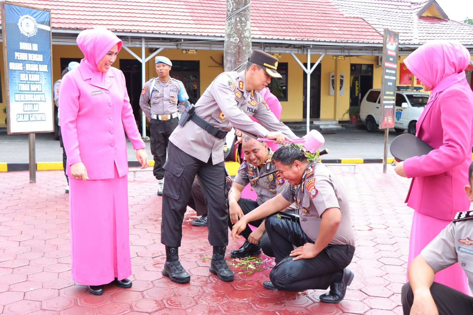 Setelah pelaksanaan upacara kenaikan pangkat dan Kapolres Kotawaringin Barat AKBP Bayu Wicaksono, S.H., S.I.K., M.Si. menyematkan pangkat kepada perwakilan Anggota yang naik pangkat, dilanjutkan dengan penyiraman air kembang kepada Anggota Polres Kotawaringin Barat yang sudah naik pangkat sebagai bentuk rasa syukur atas kenaikan pangkat yang telah didapatkan.