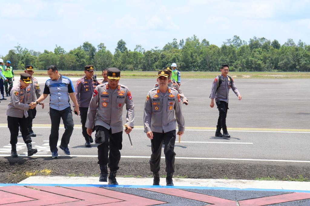Kapolres Kobar Sambut Kedatangan Kapolda Kalteng Dalam Rangka Patroli Udara Meninjau Kebakaran Hutan Dan Lahan Di Wilayah Kotawaringin Barat