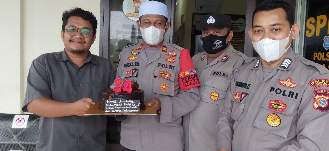 LHOKSEUMAWE,ikagawanews.id – Kapolres Lhokseumawe AKBP Eko Hartanto SIK MH diwakili Kapolsek Banda Sakti, Iptu Faisal, SH menyerahkan kue dan ucapkan selamat ulang tahun untuk Ketua Himpunan Mahasiswa Islam Indonesia (HMI) Kota Lhokseumawe, Jumat (10/5/2022).