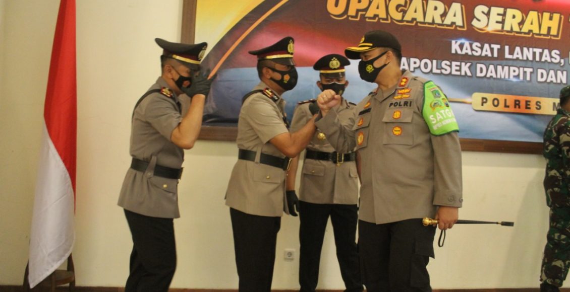 Malang, IKAGAWANEWS.ID – Di Gedung Sanika Satyawadha Polres Malang, telah dilaksanakan upacara serah terima Jabatan (Sertijab) Kasat Lantas, Kasat Polair, Kapolsek Dampit dan Kapolsek Pagelaran, pada hari Jum’at (2 Oktober 2020), sekira pukul 08.10 Wib sampai pukul 08.50 Wib.