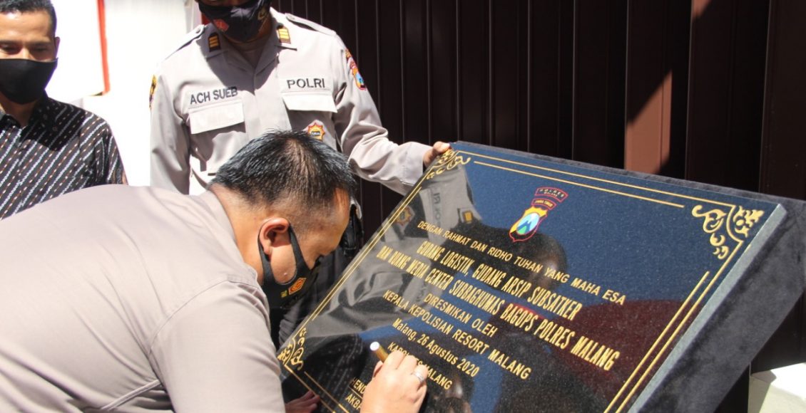 Kemudian, acara dilanjutkan dengan Penandatangan Prasasti dan penggutingan pita peresmian gedung oleh Kapolres Malang.
