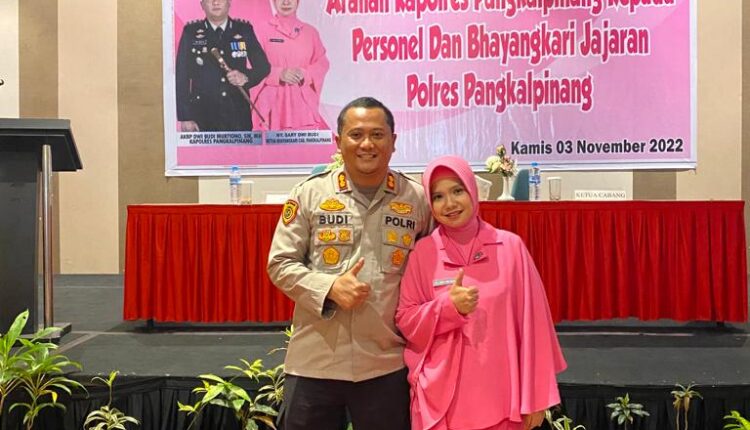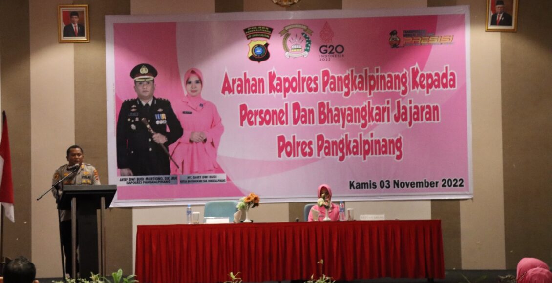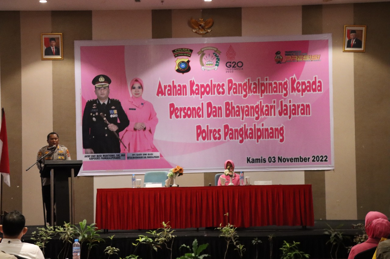 Pangkalpinang ,ikagawanews.id – Kapolres Pangkalpinang AKBP Dwi Budi Murtiiono, S.I.K M.H, didampingi Ketua Bhayangkari Cabang Pangkalpinang Ny. Sary Dwi Budi memberikan arahan kepada personel dan Bhayangkari se-jajaran Polres Pangkalpinang.
