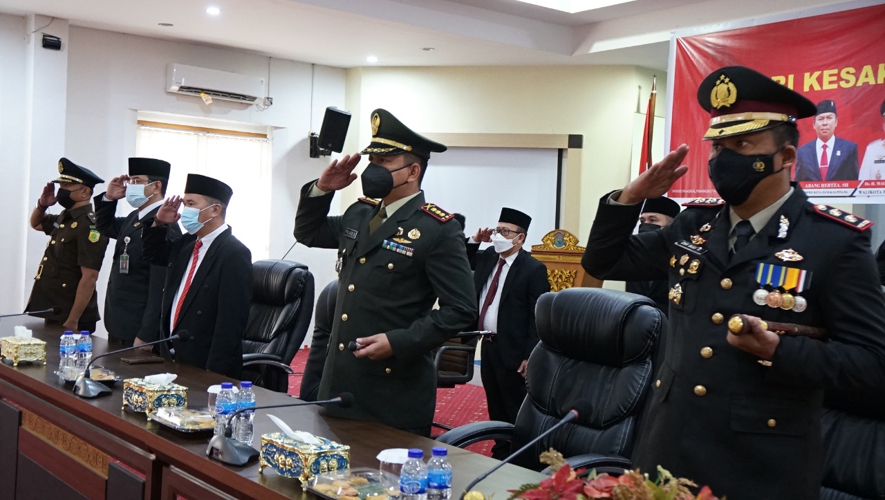 Kapolres Pangkalpinang AKBP Dwi Budi Murtiono, S.IK M.H bersama Forkopimda tampak khidmat mengikuti seluruh rangkaian upacara Hari Kesaktian pancasila yang dipimpin langsung Presiden Joko Widodo (Jokowi) secara virtual.