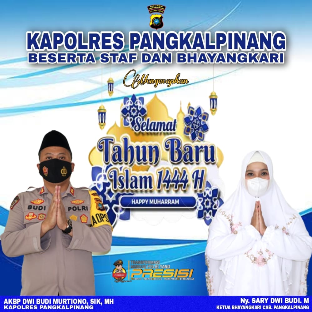 Kepala Kepolisian Resor Pangkalpinang AKBP Dwi Budi Murtiono, S.IK M.H, berserta Ketua Bhayangkari Cabang Pangkalpinang Ny. Sary Dwi Budi dan Staf memberikan ucapan kepada seluruh umat Muslim, Selamat Tahun Baru Hijriyah, 1 Muharram 1444 H / 2022 M.