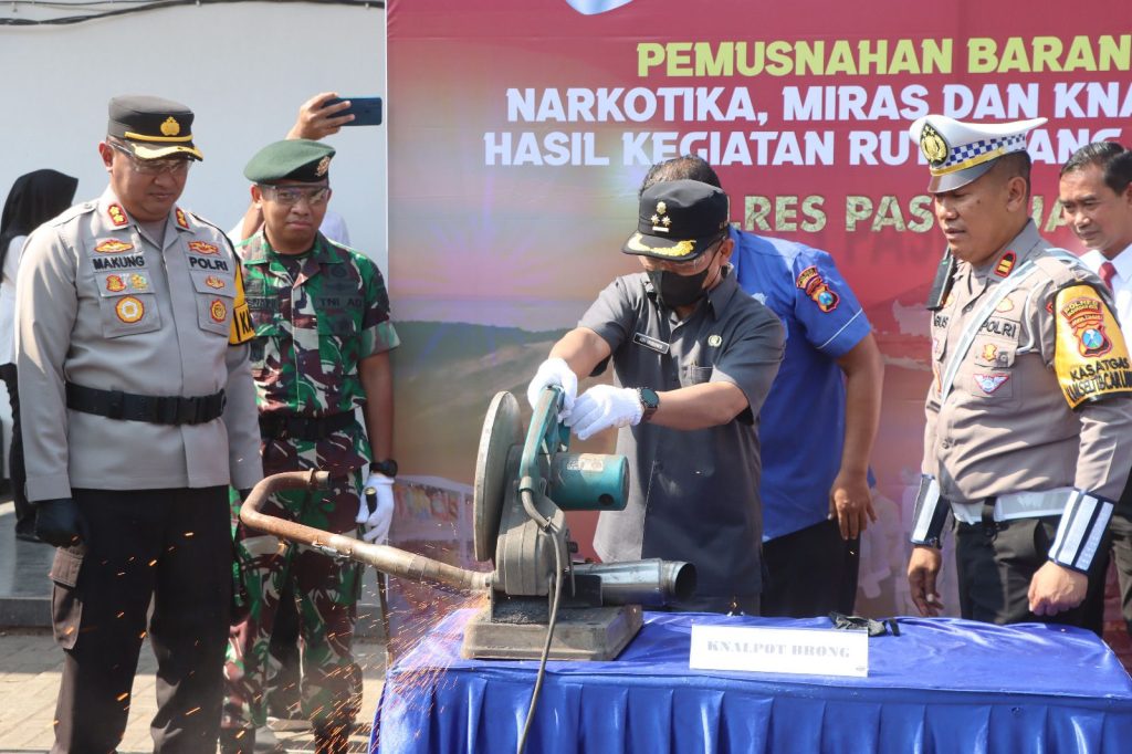 “Usai apel, dilaksanakan juga pemusnahan barang bukti narkotika, minuman keras (miras), serta knalpot brong yang berhasil diamankan dalam operasi sebelumnya. Pemusnahan barang bukti ini dilakukan sebagai langkah konkret dalam memberantas peredaran narkotika dan merespons keluhan masyarakat terkait ketertiban di lingkungan sekitar.” Ucap Kapolres Pasuruan Kota.