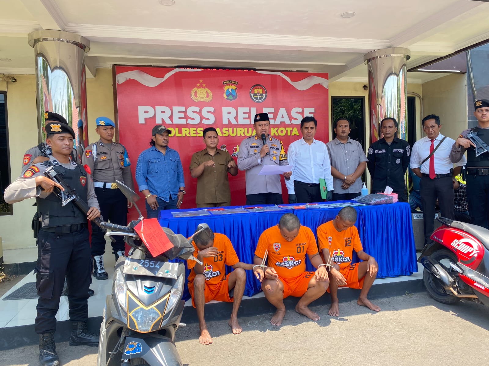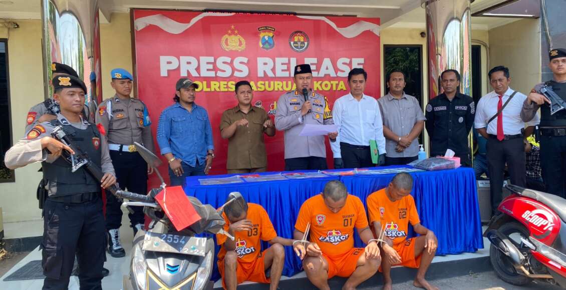Adapun tiga tersangka yang berhasil diamankan oleh Satreskrim Polres Pasuruan Kota, yakni tersangka AJ (19) warga Tlogosari Kec.Sumber Malang, Kota/Kab. Situbondo, N (33) warga Kel. Kepel Kec. Bugul Kidul, Kota Pasuruan, dan IR (24) warga Kel. Ngemplakrejo Kec. Panggungrejo, Kota Pasuruan.