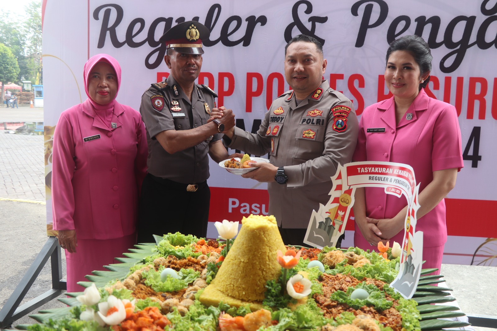 Kegiatan dilanjutkan dengan Pemotongan Tumpeng oleh Kapolres Pasuruan dan Ketua Bhayangkari Cabang Pasuruan dengan penerima personil dengan pangkat paling Senior dan Junior sebagai simbolis suksesnya pelaksanaan kenaikan pangkat.