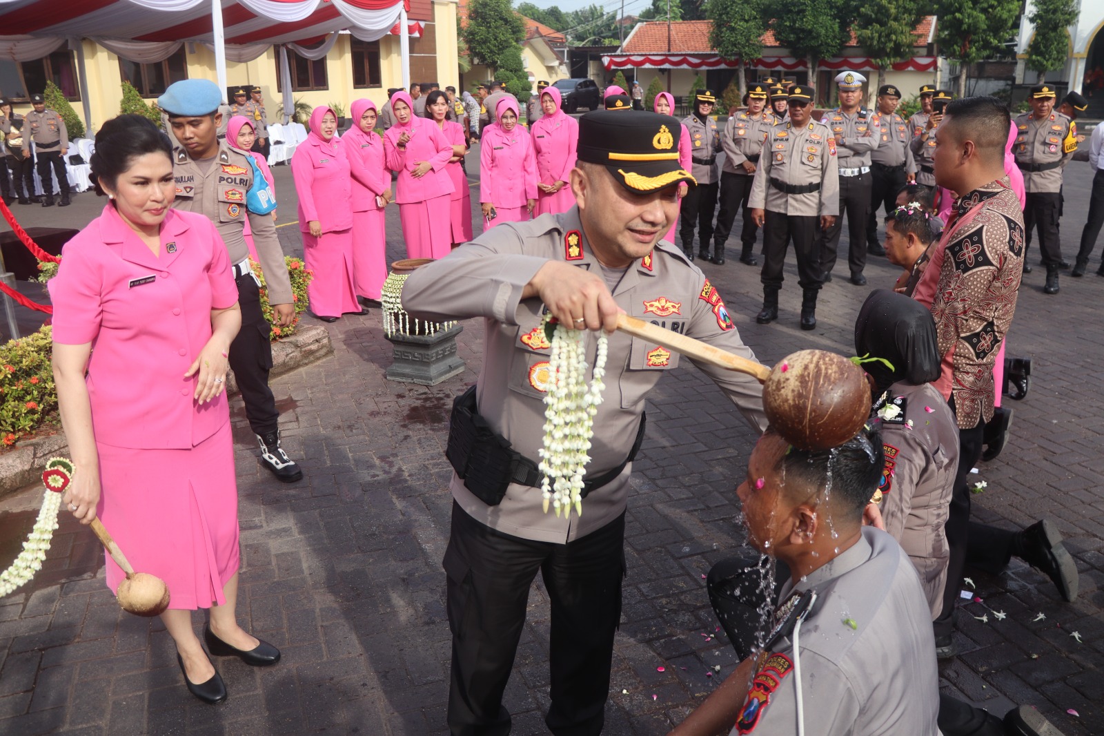 Selanjutnya Penyiraman air bunga setaman oleh Kapolres Pasuruan dan Ketua Bhayangkari Cabang Pasuruan kepada Personil yang naik pangkat.