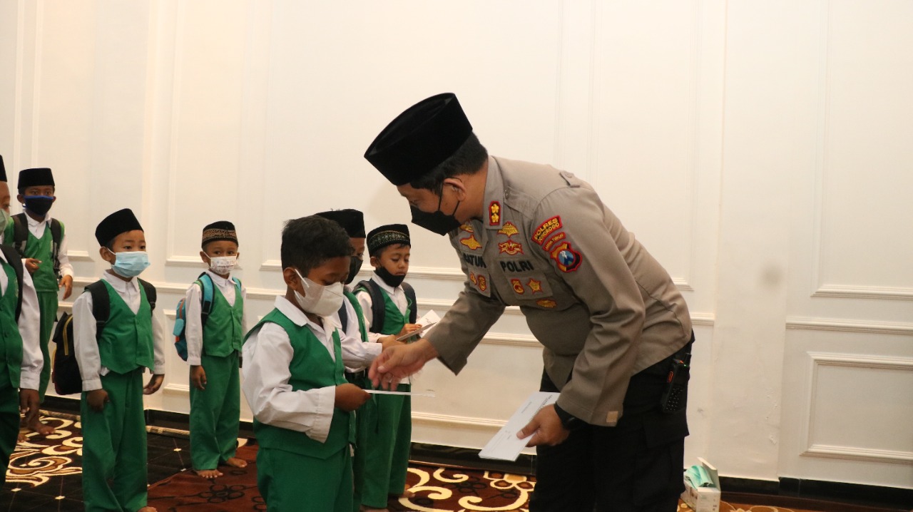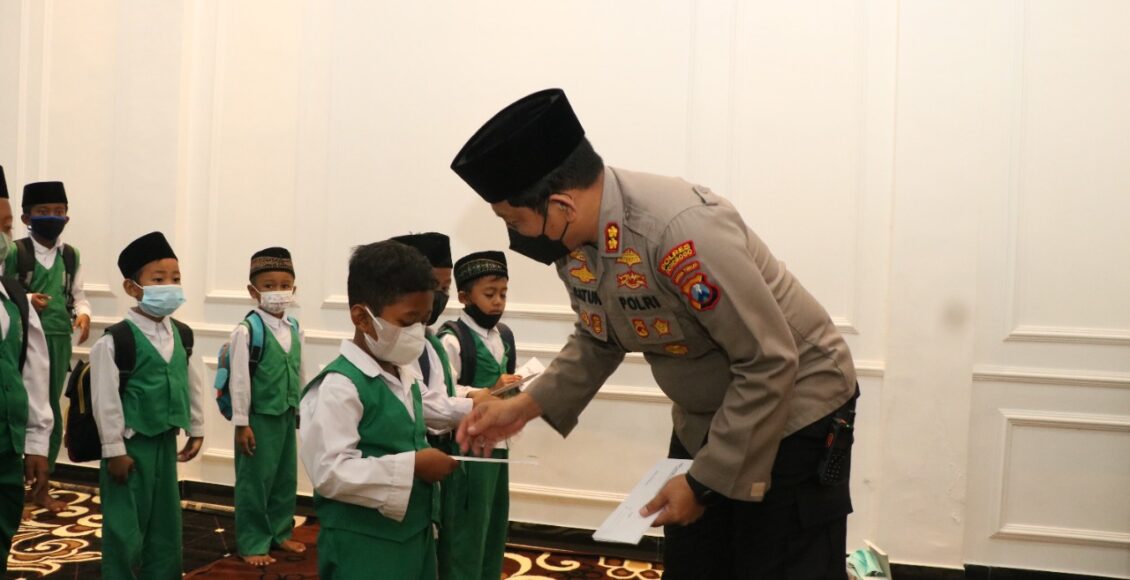 Kemudian Acara dilanjutkan Kapolres Ponorogo yaitu dengan menyerahkan santunan kepada 25 anak yatim piatu dari panti Asuhan Abu Bakar