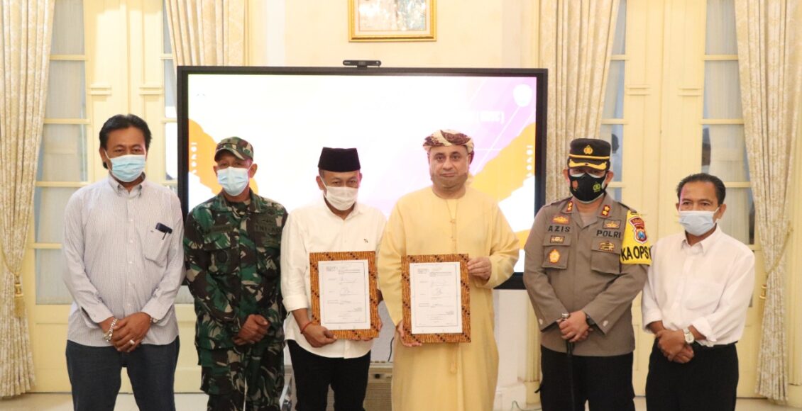 Bertempat di pringgitan, Bupati Sugiri Sancoko disaksikan wakil bupati, Forkompinda Kabupaten seperti terlihat Kapolres Ponorogo, AKBP Mochammad Nur Azis dan perwakilan dari kodim 0802 Ponorogo melakukan kerjasama atau MoU dengan Group of Development Technologies and Construction Companies (GDTC).