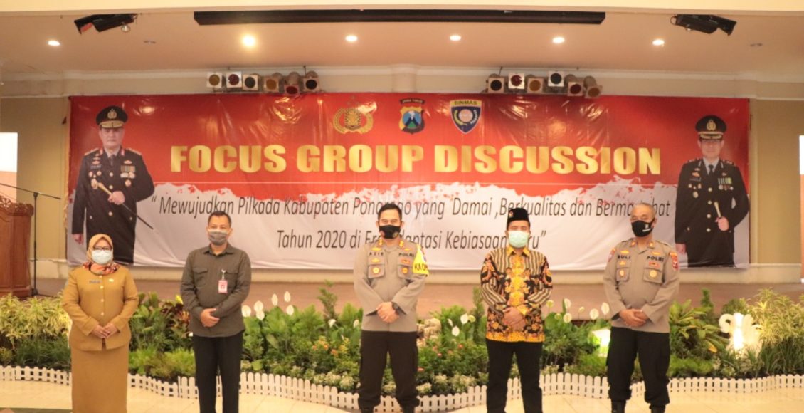 Dalam Sambutannya, Kapolres Ponorogo mengatakan, “FGD ini mengusung tema Mewujudkan Pilkada Kabupaten Ponorogo yang damai, berkualitas dan bermartabat  Tahun 2020 di Era Adaptasi Kebiasaan Baru”