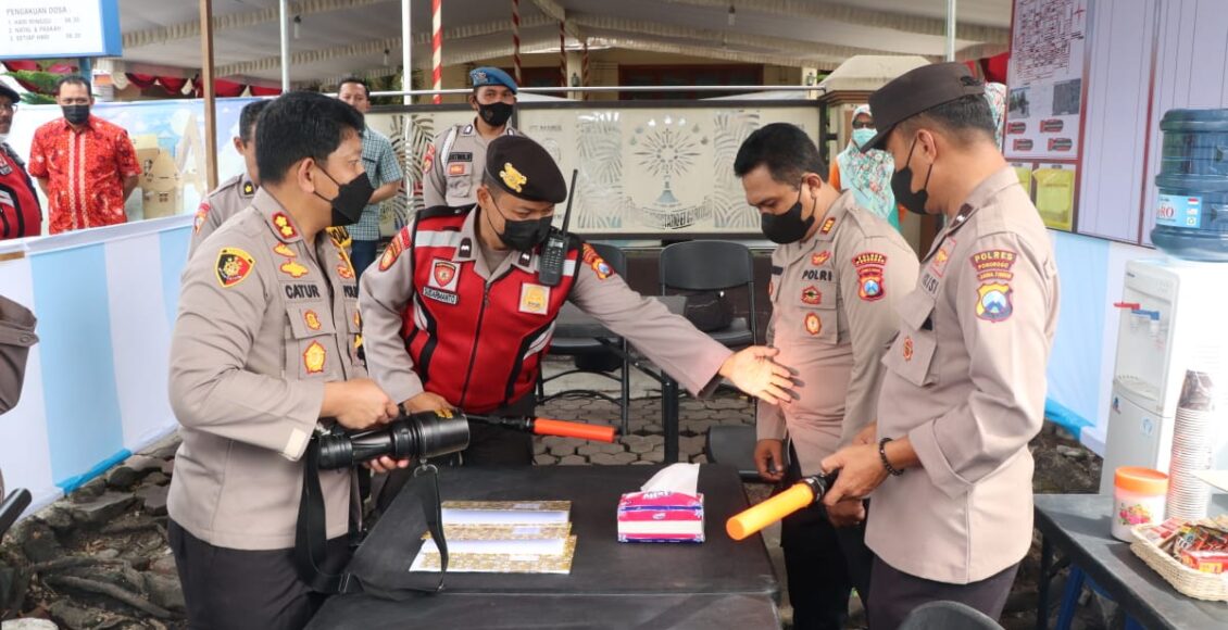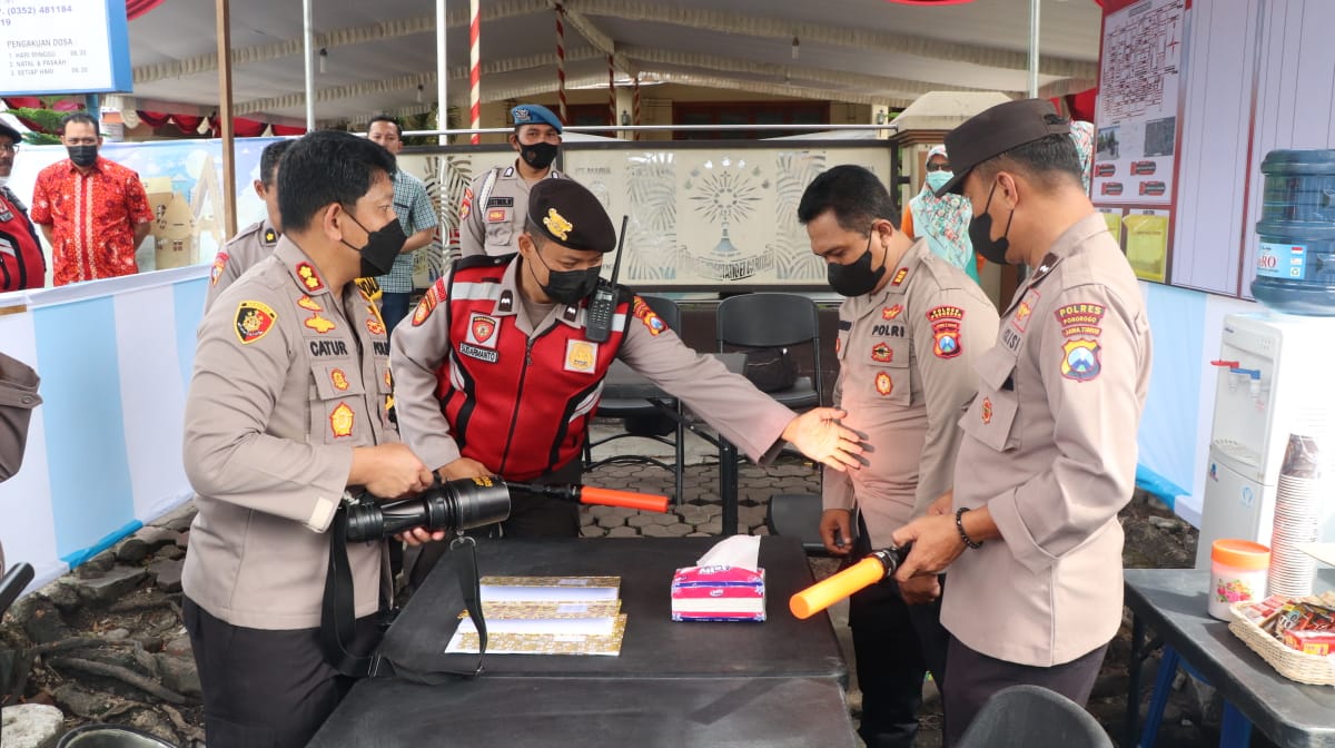 Pada pos tersebut Kapolres Ponorogo memberikan beberapa penekanan kepada personil pos yang sedang berjaga. Selain itu, pihaknya juga mengecek beberapa saranan dan prasarana mulai dari metal detektor, tongkat T, Senter hingga senjata api anggota.
