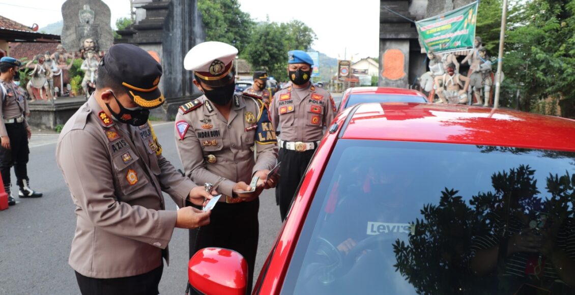 Dalam kegiatan ini, Kapolres Ponorogo beserta PJU dan petugas jaga Pos perbatasan membagikan masker dan memeriksa kelengkapan surat – surat kendaraan.