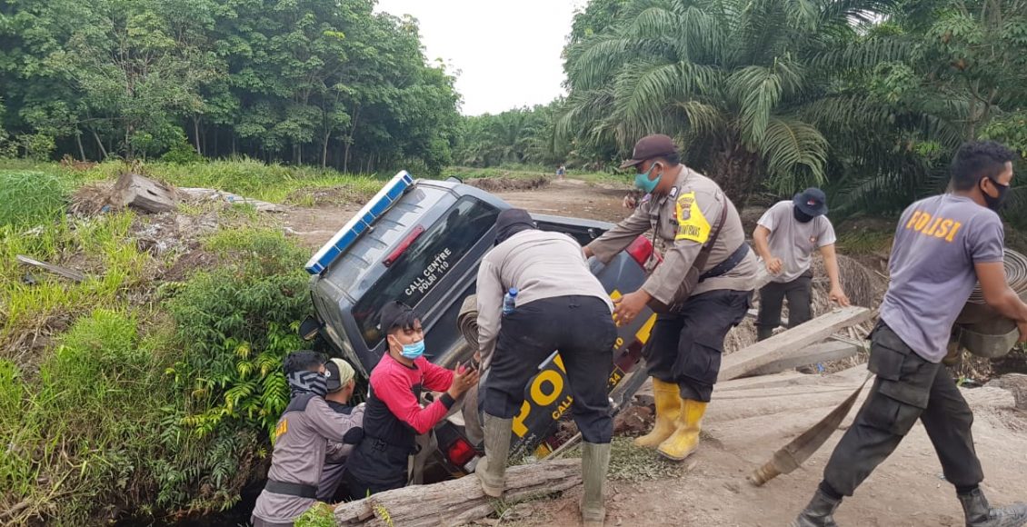 Walaupun Mobil Tim Pemadam Kebakaran Polres Rohil Terperosok Keparit Bekoan, Namun Tetap Semangat Padamkan Titik Api