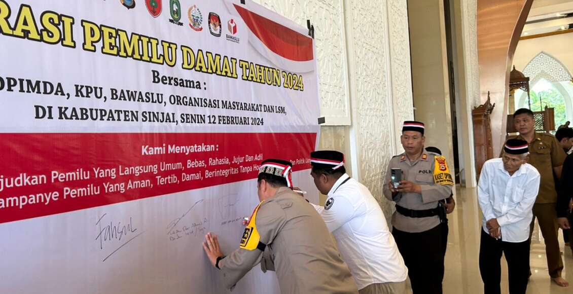 SINJAI,ikagawanews.id – Kapolres Sinjai Akbp Fery Nur Abdulah, S.Ik bersama forkopimda lakukan penandatangan deklarasi Pemilu damai 2024 dengan jajaran Pemerintah Kabupaten Sinjai dan para Forkopimda.