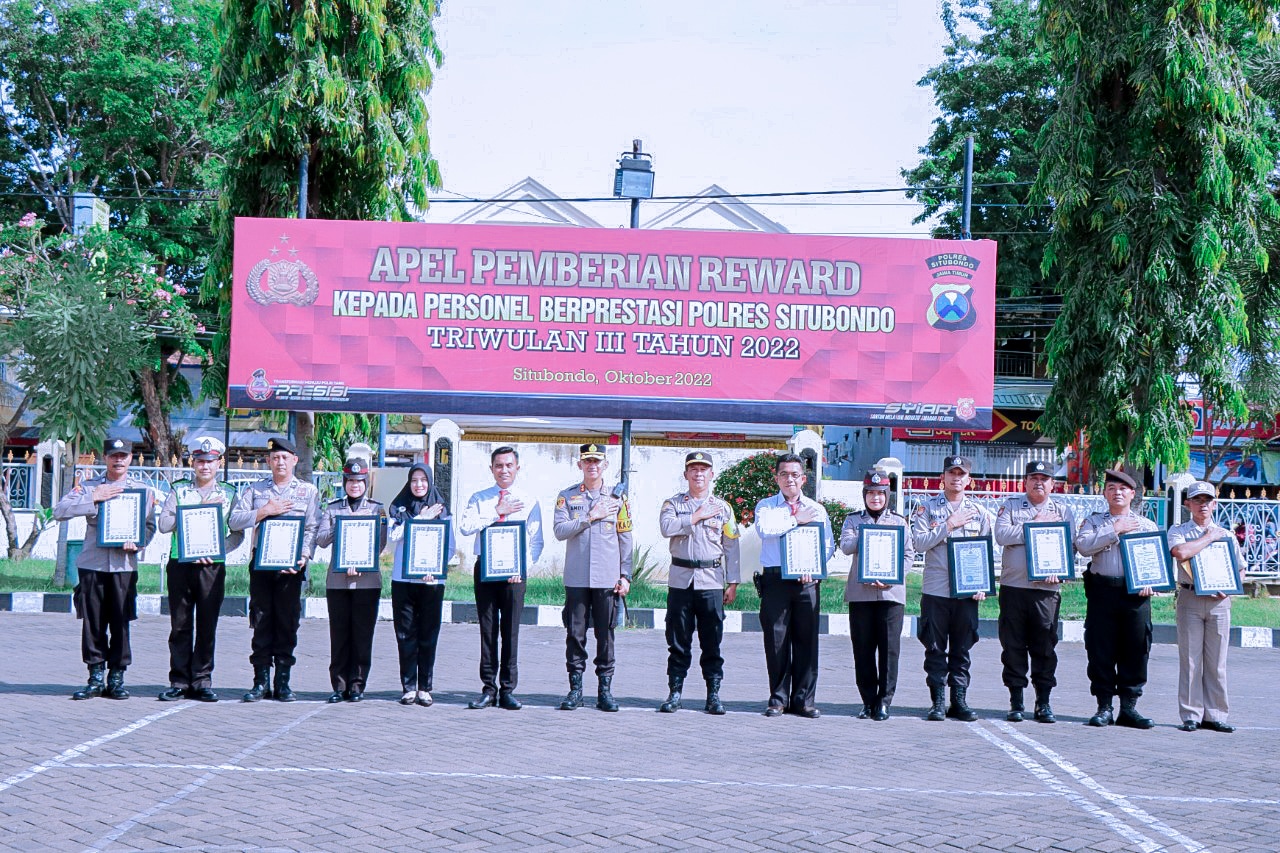 Personil yang menerima reward ada beberapa kategori diantaranya Ipda Ocky Heru Prasetyo, S.Psi, M.H., Kanit II Satreskrim berhasil menungkap kasus perjudian, Aipda Agus Bastomi, S.H., Ps. Kanit Reskrim Polsek Besuki berhasil ungkap kasus Narkotika, Aipda Moh.Dewarzen Yahya, S.H., Ps. Kanit Dalmas Satsamapta berhasil mengungkap kasus peredaran obat terlarang atau Pil Trex, Brigadir Tony Agus Prasetyo, S.H., Bamin Bagren sebegai operator ZI berhasil membawa Polres Situbondo meraih peringkat 1 aplikasi EPZI Satwil jajaran Polda Jatim, Bripka Bayu Ruby Hardianto, S.H., Banit Satlantas peraih Tilang terbanyak bulan Juli – September 2022.