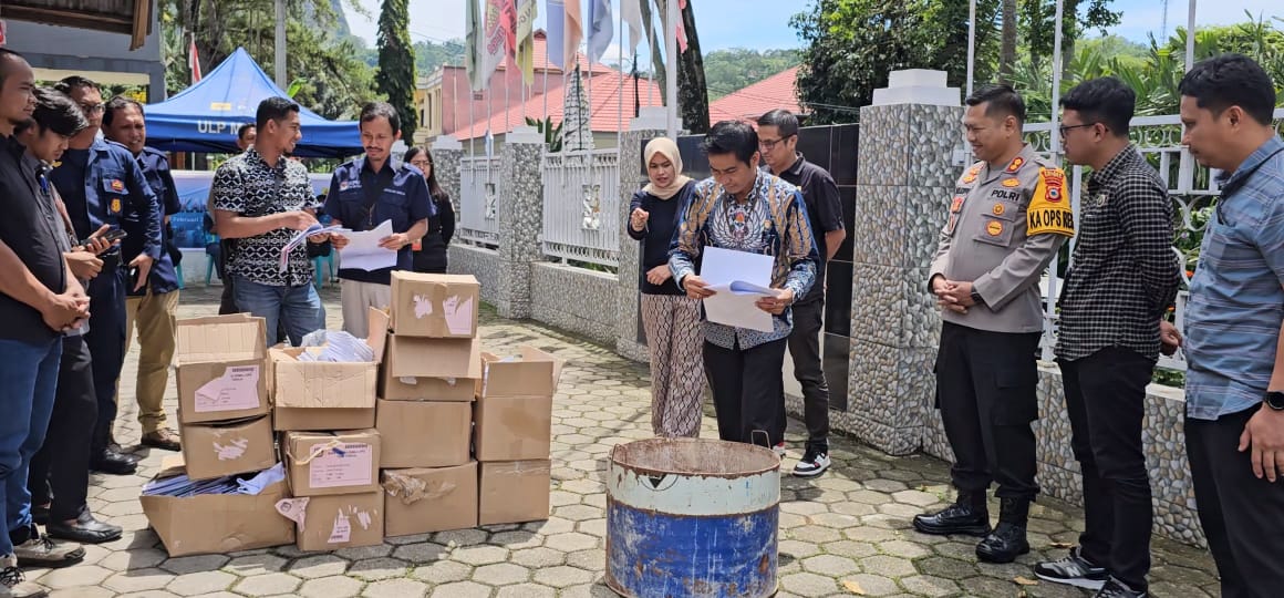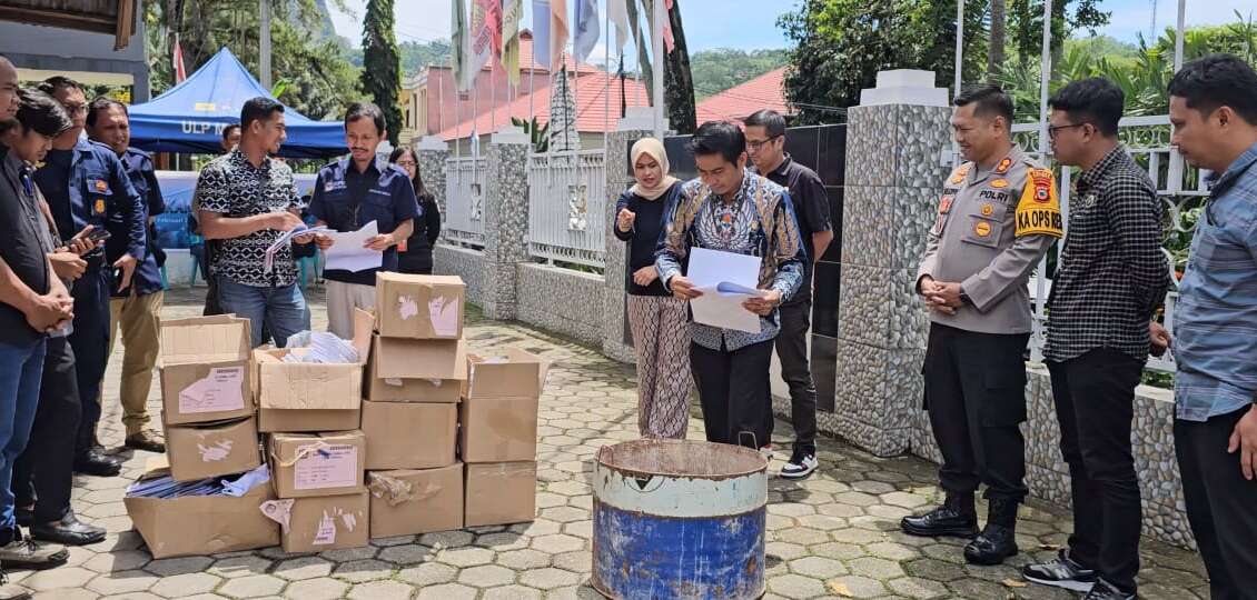 Kehadiran pihak Kepolisian dan Bawaslu dalam proses pemusnahaan kertas surat suara pemilu tahun 2024 guna memastikan proses pemusnahan dapat berjalan aman dan tertib