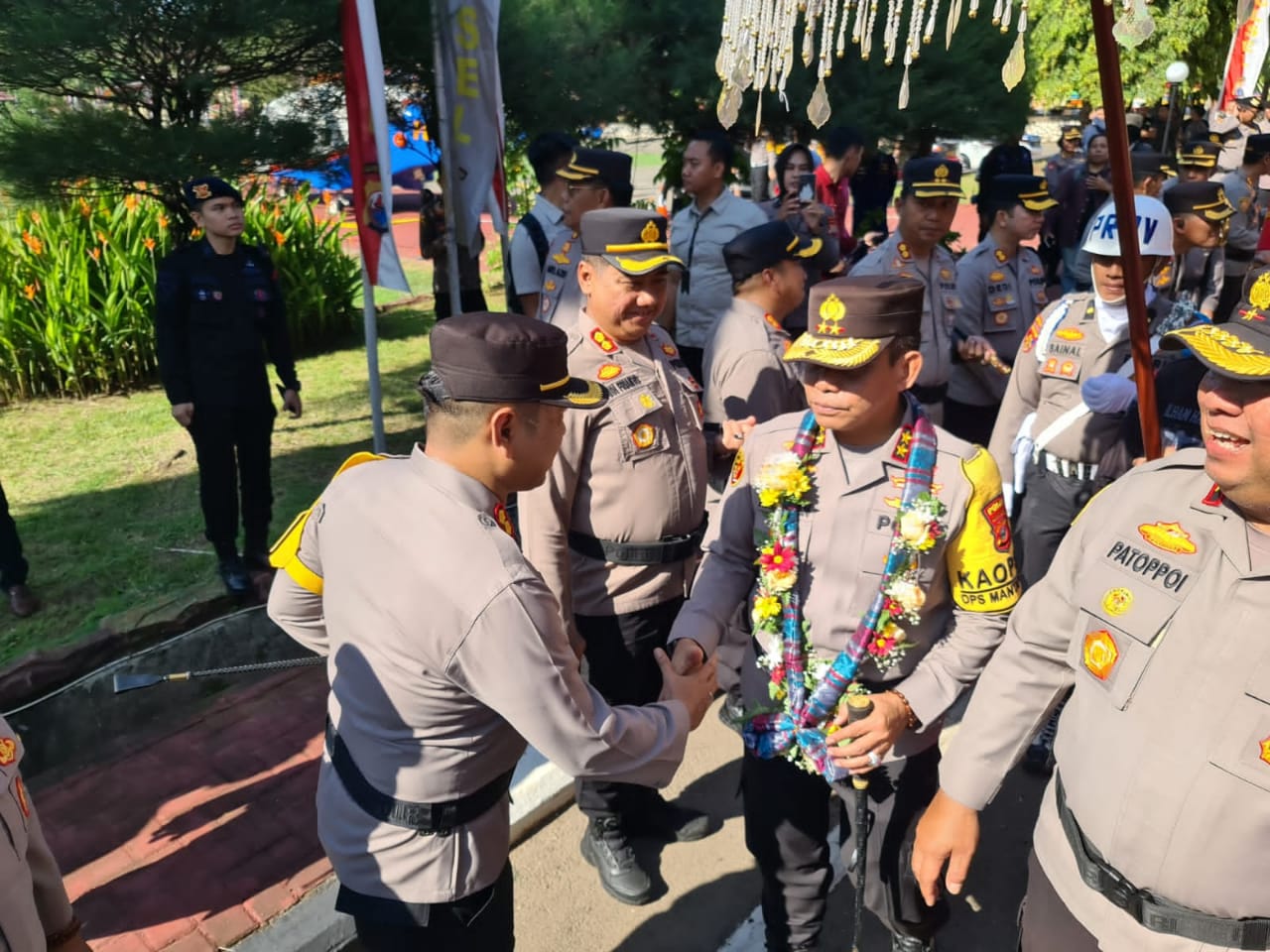 Kedatangan Irjen Pol Andi Rian R.Djajadi dimaknai dengan pengalungan bunga oleh Waka Polda Sulsel Brigjen Pol Chuzaini Patoppoi.