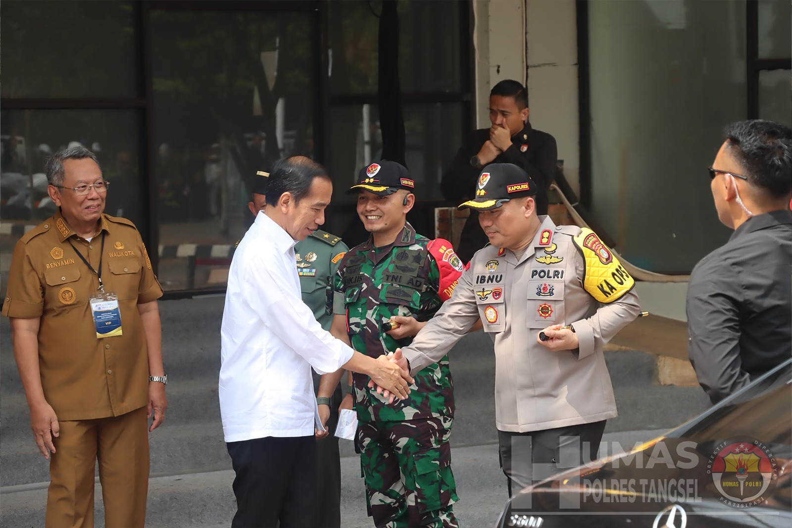 Tampak hadir juga dalam kegiatan kunjungan presiden RI tersebut diantaranya Jenderal Pol (Purn) Prof. Drs. M. Tito Karnavian, B.A., M.A., Ph.D. (Mendagri), Mayor Jenderal TNI M. Hasan (Pangdam Jaya), Irjen Pol. Karyoto ( Kapolda Metro Jaya ), Brigjen TNI Putranto Gatot S.H, S.Sos (Danrem 052/Wkr), Drs. H. Benyamin Davnie (Walikota Tangsel), H. Abdul Rasyid, S.Ag, M.Ap (Ketua DPRD Kota Tangsel), Letkol Inf. Endik Hendra Sandi S.Sos, M.I.Pol (Dandim 0506/Tgr) dan AKBP Ibnu Bagus Santoso, S.I.K, MM, MH (Kapolres Tangsel).