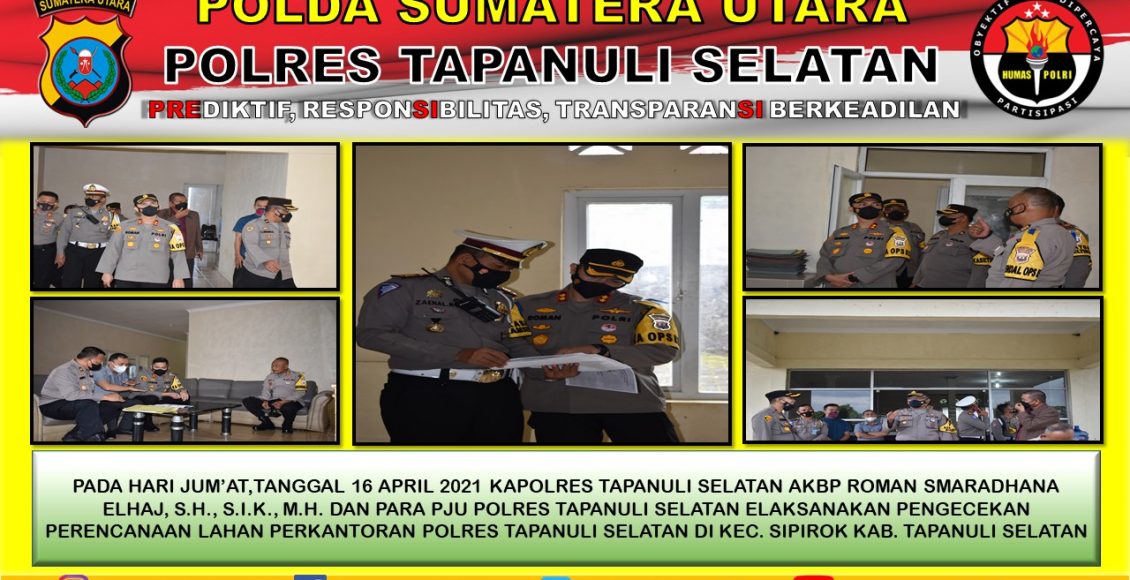 Tapsel,IKAGAWANEWS.ID – Kepala Kepolisian Resort (Kapolres) Tapanuli Selatan AKBP ROMAN SMARADHANA ELHAJ, S.H., S.I.K., M.H Melaksanaan Kegiatan Pengecekan Rencana Lahan Perkantoran Polres Tapanuli Selatan dan Lahan Perumahan Graha Wicaksana Laghawa yang dipimpin langsung oleh  Kapolres,Lokasi Kantor Badan Pengelolaan Pajak dan Retribusi Daerah Provinsi Sumatera Utara (BPPRDSU)  cabang Sipirok dan Desa Marisi Kec. Angkola Timur Kab. Tapanuli Selatan,Jumat 16 April 2021.