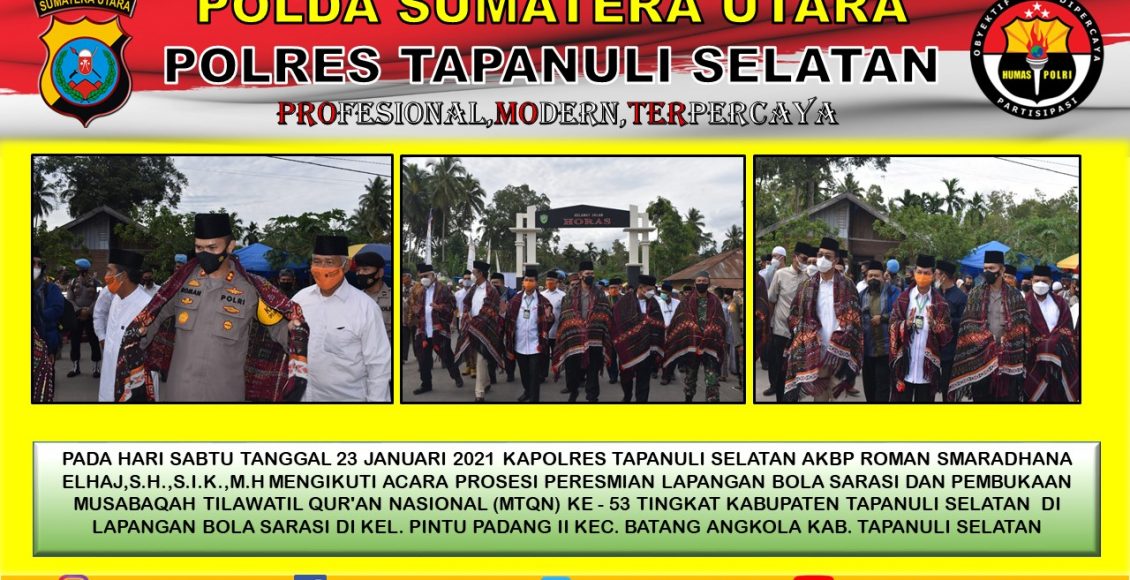 Ditambahkan, selama pelaksanaan kegiatan acara Peresmian Lapangan Bola Sarasi dan Pembukaan Musabaqah Tilawatil Qur’an Nasional (MTQN) Ke – 53 Tingkat kabupaten Tapanuli Selatan, tetap memperhatikan Protokol Kesehatan guna Mencegah Penyebaran Virus Corona (Covid 19). (Hum/Kri/Red)