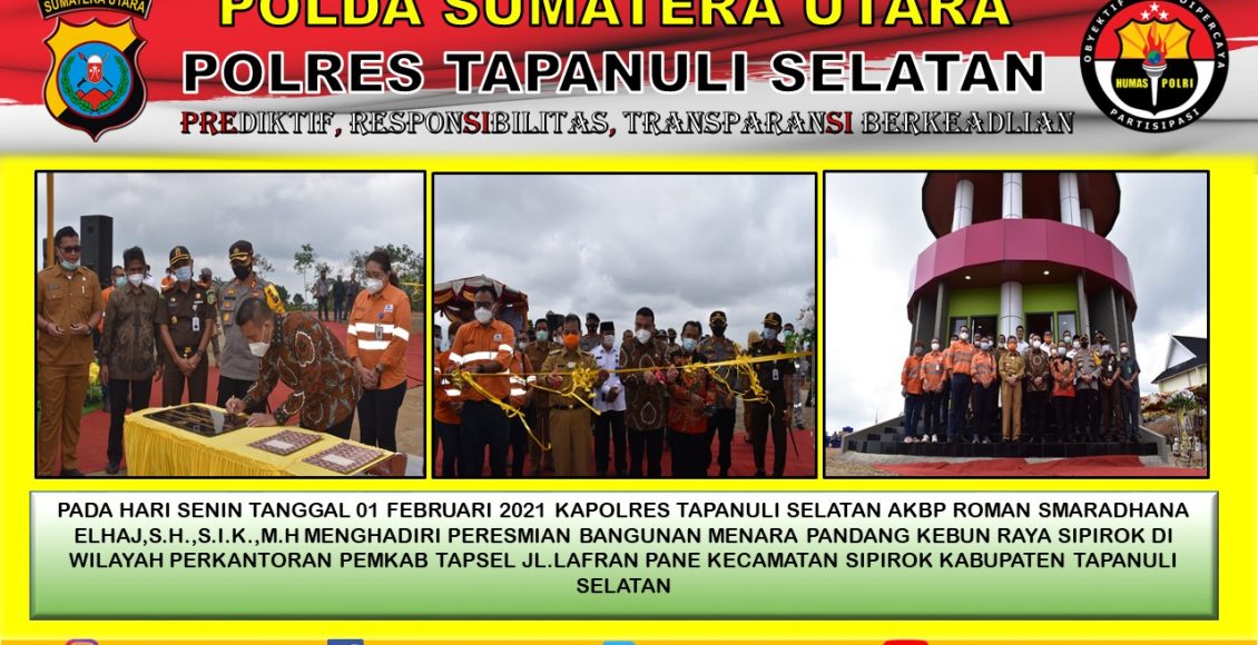 Tapanuli Selatan, IKAGAWANEWS.ID – Kapolres Tapanuli Selatan AKBP Roman Smaradhana Elhaj, S.H.,S,I.K.,M.H menghadiri Peresmian dua Bangunan. Antara lain. Menara Pandang Kebun Raya Sipirok, dan Gedung Pengelola/Kantor UPTD, pada hari Senin, (01 Februari 2021), sekira pada pukul 11:00 Wib.