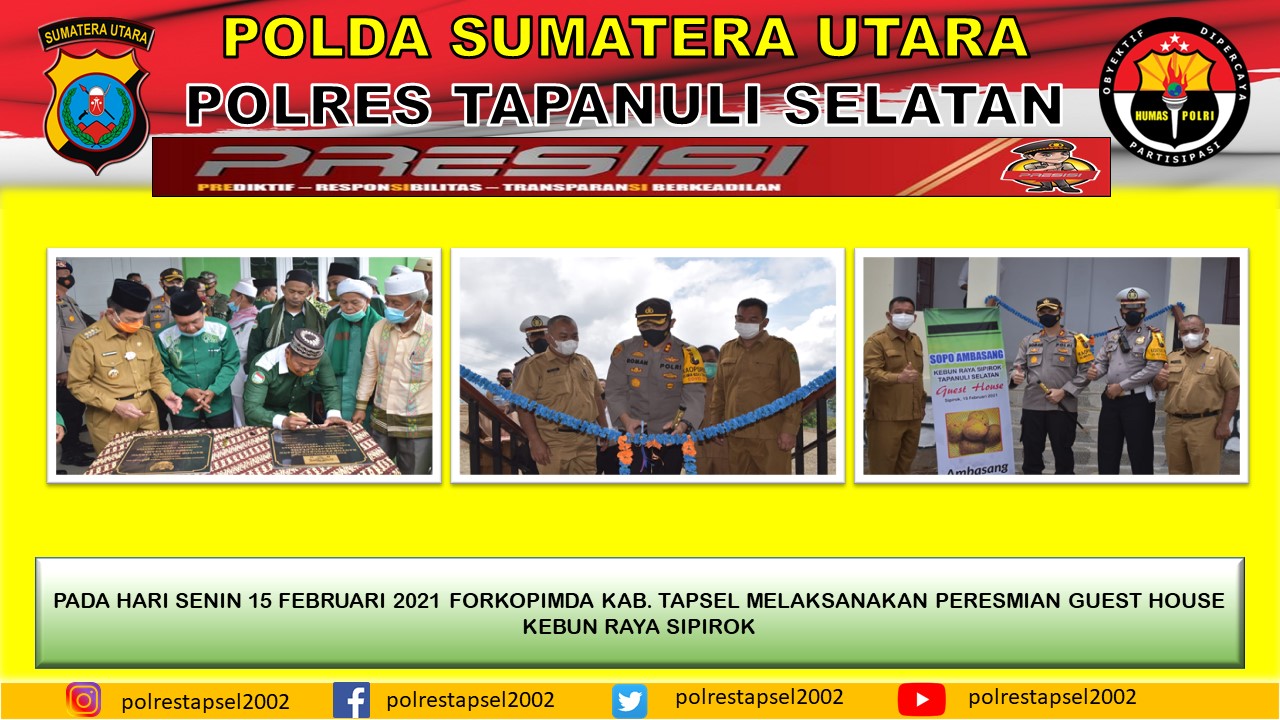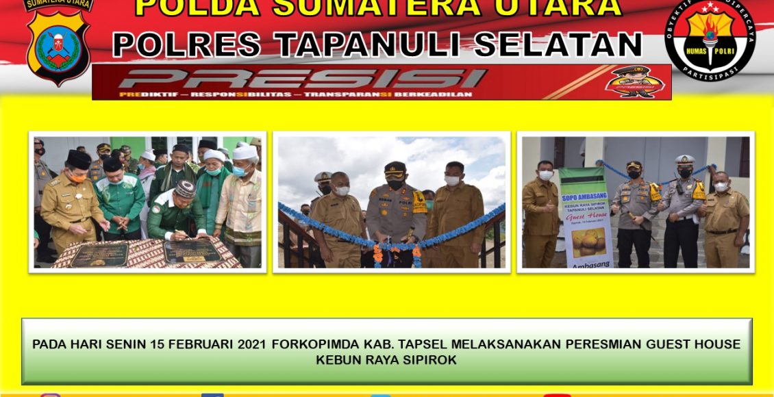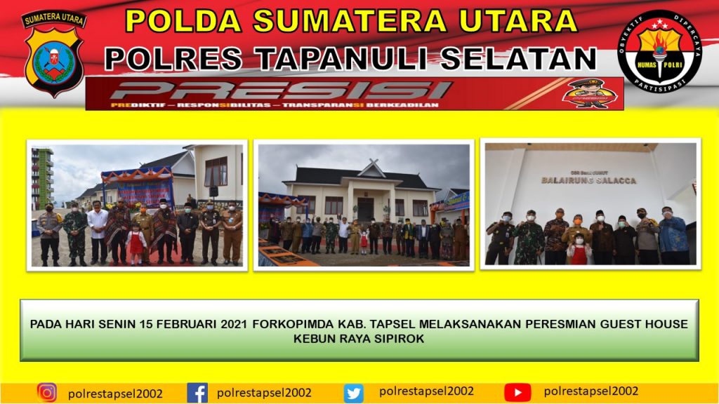 Tapsel, IKAGAWANEWS.ID – Kepala Kepolisian Resort (Kapolres) Tapanuli Selatan (Tapsel) AKBP Roman Smaradhana Elhaj SH, S.I.K MH mengikuti Peresmian Guest House Kebun Raya Sipirok Kab. Tapsel oleh Bupati Tapsel, pada hari senin (05/02/2021).