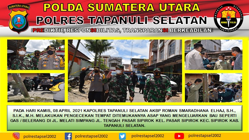 Tapanuli Selatan,IKAGAWANEWS.ID – Kepolisian Resort (Polres) Kapolres Tapanuli Selatan AKBP ROMAN SMARADHANA ELHAJ, S.H., S.I.K., M.H. pimpin pelaksanakan kegiatan peninjauan penemuan asap yg mengeluarkan bau seperti gas / belerang pada bagian tanah yg mengeluarkan asap,lokasi Di Jl. Melati simpang Jl. Tengah Pasar Sipirok Kel. Pasar Sipirok Kec. Sipirok Kab. Tapanuli Selatan tepatnya belakang alun – alun Sipirok,08 April 2021.