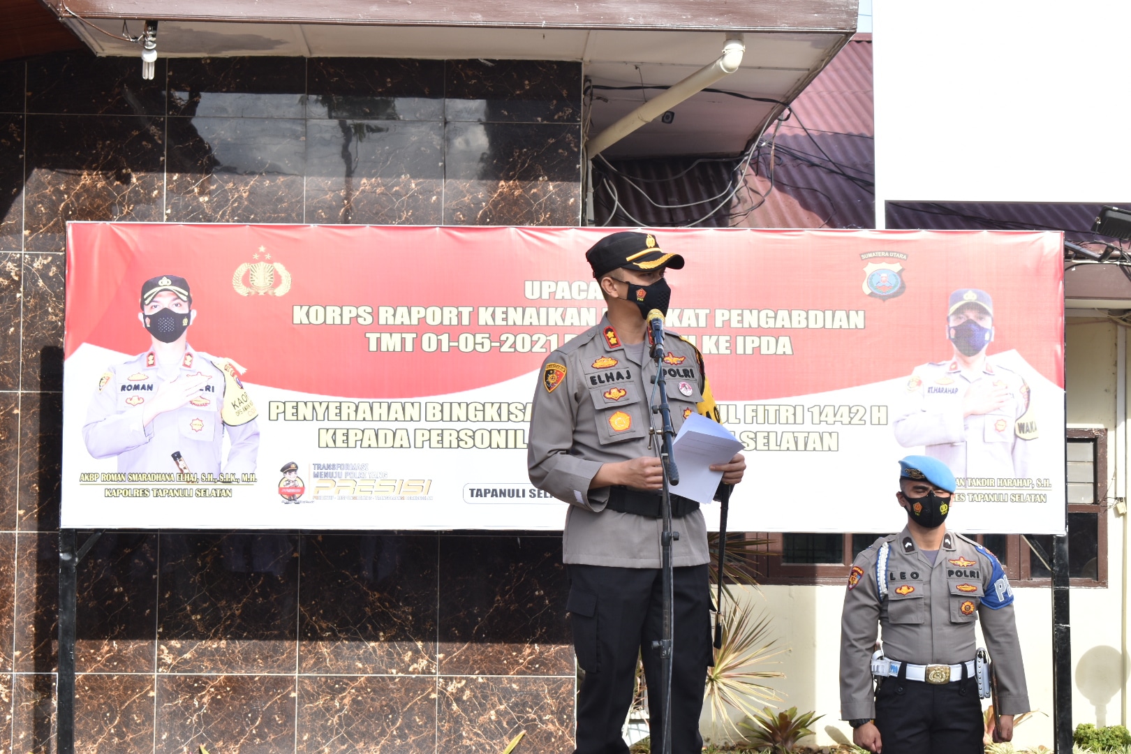 Tapanuli Selatan,IKAGAWANEWS.ID  – Kepala Kepolisian Resort (Kapolres)Tapanulis Selatan AKBP ROMAN SMARADHANA ELHAJ, S.H., S.I.K., M.H.pimpin Pelaksanaan Kegiatan Upacara Korps Rapot Kenaikan Pangkat Pengabdian TMT 01 – 05 – 2021 dari AIPTU ke IPDA dan Pemberian Bingkisan Hari Raya Idul Fitri 1442 H Kepada Personil Polres Tapanuli Selatan,di Halaman Apel Polres Tapanuli Selatan,Senin  03 Mei 2021.