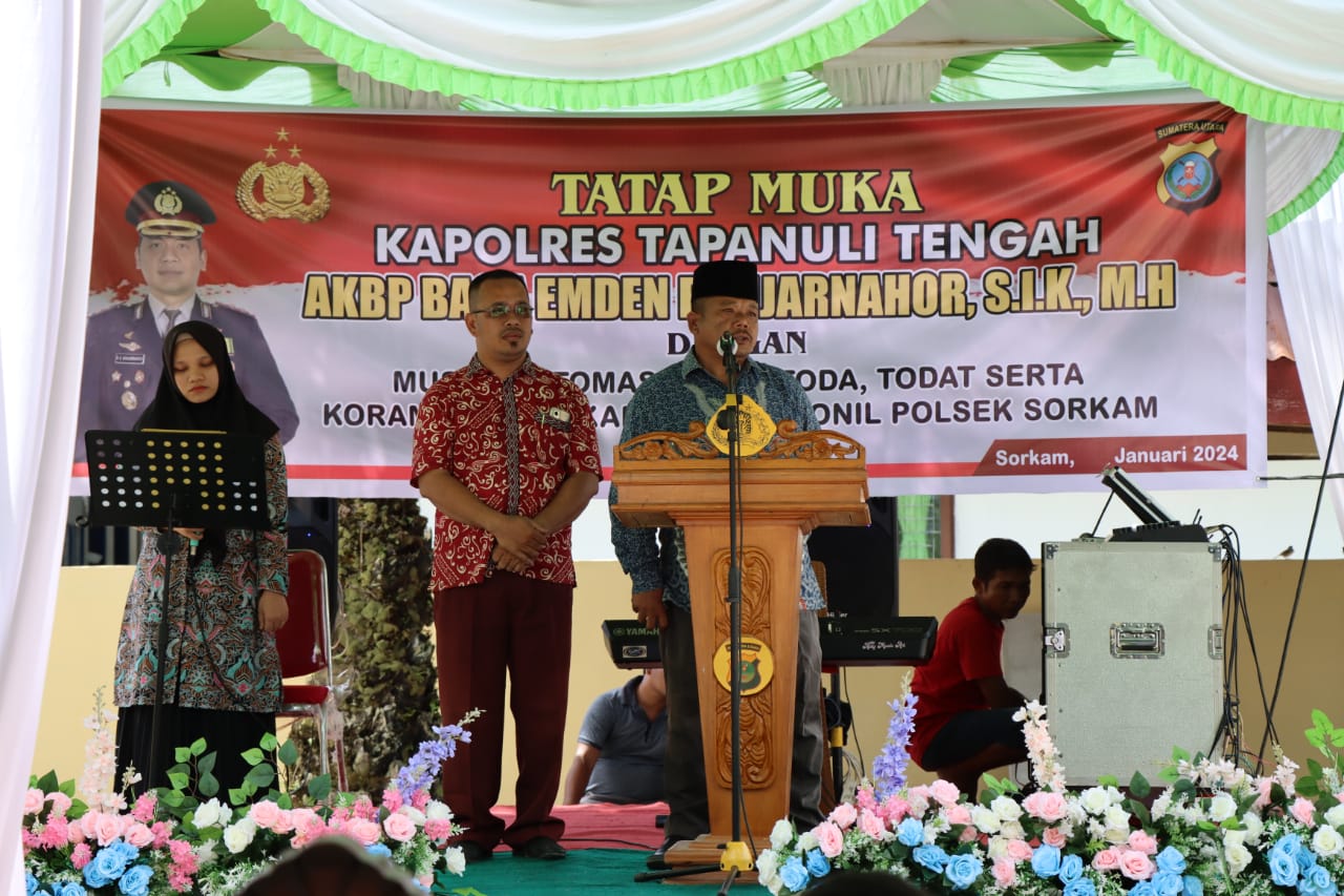 TAPTENG, ikagawanews.id – Kapolres Tapanuli Tengah AKBP Basa Emden Banjarnahor, S.I.K., M.H., dan Ketua Bhayangkari Cabang Tapanuli Tengah Ny. Heny Basa Emden Banjarnahor, bersama rombongan pejabat utama Polres Tapanuli Tengah, melakukan kunjungan kerja ke wilayah hukum Polsek Sorkam. Kegiatan ini dilaksanakan dalam rangka membangun sinergi dan motivasi kepada anggota, serta memperkuat kerjasama dengan elemen Masyarakat di Lapangan Polsek Sorkam. Kamis (16/01/2024). pukul 14.00 WIB hingga 15.20 WIB.