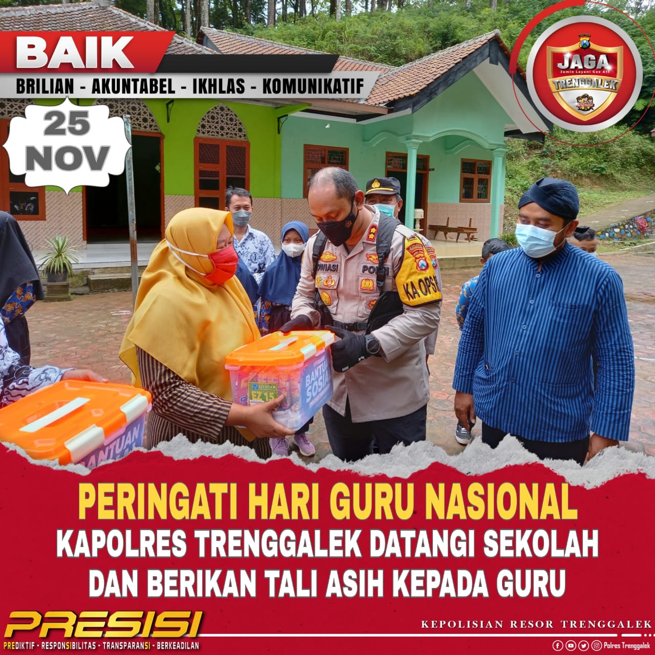 “Iya benar, hari ini kami berkunjung ke rumah bapak Sutikno. Salah satu warga Desa Depok Kecamatan Bendungan yang rumahnya tertimpa tanah longsor.” Ujar AKBP Dwiasi