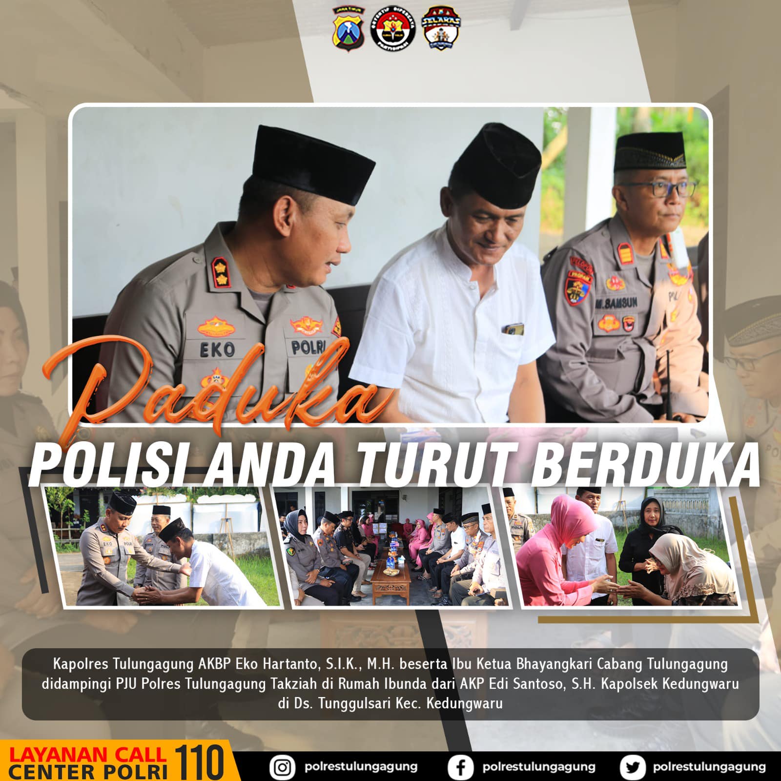 Turut hadir dalam kegiatan Takziah ke keluarga almarhum maupun Almarhumah orang tua AKP Edy Santoso maupun Aiptu Dwi Purwanto antara lain Kapolres Tulungagung AKBP Eko Hartanto SIK MH, Ketu cabang bhayangkari polres Tulungagung, Pju polres, pengurus cabang bhayangkari, perwakilan anggota Polres Tulungagung. (Ans71 Restu)