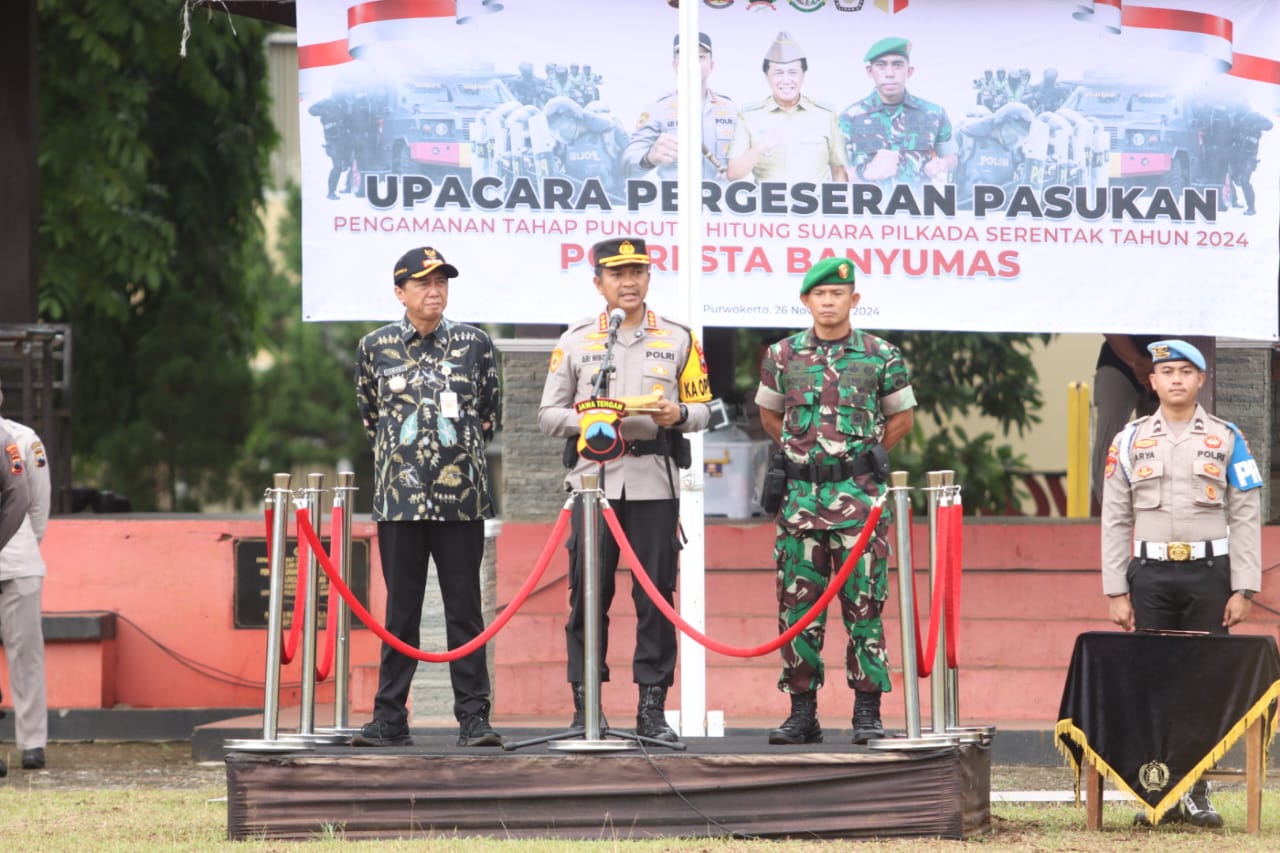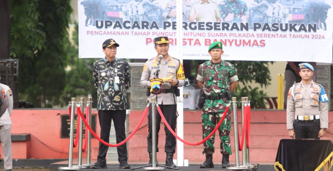 BANYUMAS,ikagawanews.id – Polresta Banyumas melaksanakan kegiatan Upacara Pergeseran Pasukan Pengamanan Tahap Pungut Suara Pilkada Serentak Tahun 2024, Selasa (26/11/24) yang dimulai pukul 08:00 wib.