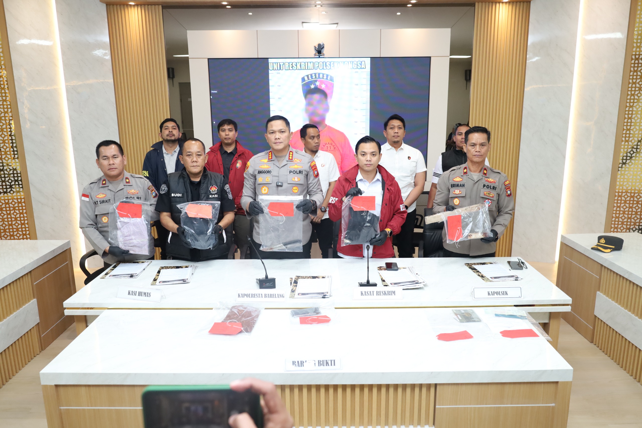 BARELANG,ikagawanews.id – Polresta Barelang menggelar konferensi pers terkait pengungkapan kasus tindak pidana pembunuhan berencana yang terjadi di wilayah Kecamatan Nongsa. Kegiatan konferensi pers tersebut dilaksanakan di Ruang Rapat Wicaksana Laghawa Lantai 3 Polresta Barelang dan dipimpin langsung oleh Kapolresta Barelang Kombes Pol. Anggoro Wicaksono, S.H., S.I.K., M.H., didampingi Kasat Reskrim Polresta Barelang Kompol M. Debby Tri Andrestian, S.I.K., M.H.Li., Kasi Humas Polresta Barelang AKP Budi Santosa, S.H., Kapolsek Nongsa Kompol Eriman, Kanit IV Jatanras Polresta Barelang AKP Doddy Masyir, S.H., M.H., serta Kasubnit 8 Satreskrim Polresta Barelang Iptu Maryo Sandro Putra Siahaan, S.I.Kom. Dalam kegiatan tersebut disampaikan perkembangan penanganan kasus pembunuhan yang menewaskan seorang korban dan mengakibatkan satu korban lainnya mengalami luka-luka. Rabu, (11/03/2026).