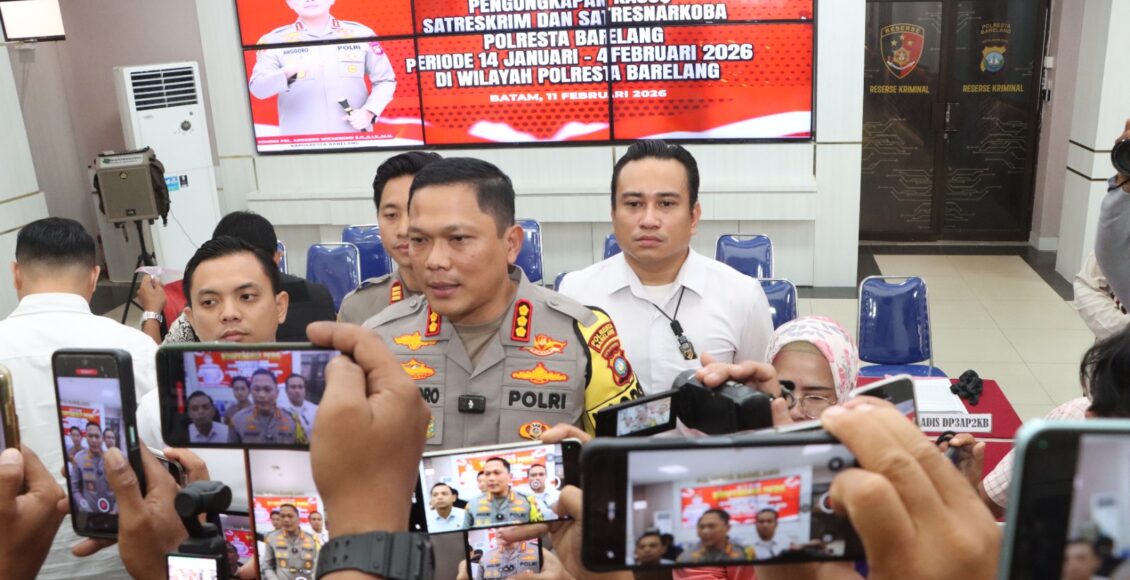 BARELANG,ikagawanews.id – Polresta Barelang menggelar Konferensi Pers terkait pengungkapan kasus tindak pidana narkotika oleh Satuan Reserse Narkoba Polresta Barelang periode 14 Januari hingga 04 Februari 2026. Kegiatan tersebut dipimpin langsung oleh Kapolresta Barelang Kombes Pol Anggoro Wicaksono, S.H., S.I.K., M.H., didampingi Kasat Reskrim Polresta Barelang Kompol M. Debby Tri Andrestian, S.I.K., M.H.Li., Kasat Resnarkoba Polresta Barelang Kompol Dr. Arsyad Riyandi, S.IP., M.H., Kapolsek Batu Aji AKP Bayu Rizki Subagyo, S.Tr.K., S.I.K., serta Kasihumas Polresta Barelang AKP Budi Santosa, S.H. Konferensi pers dilaksanakan di Lobby Polresta Barelang, Rabu, (11/02/2026).