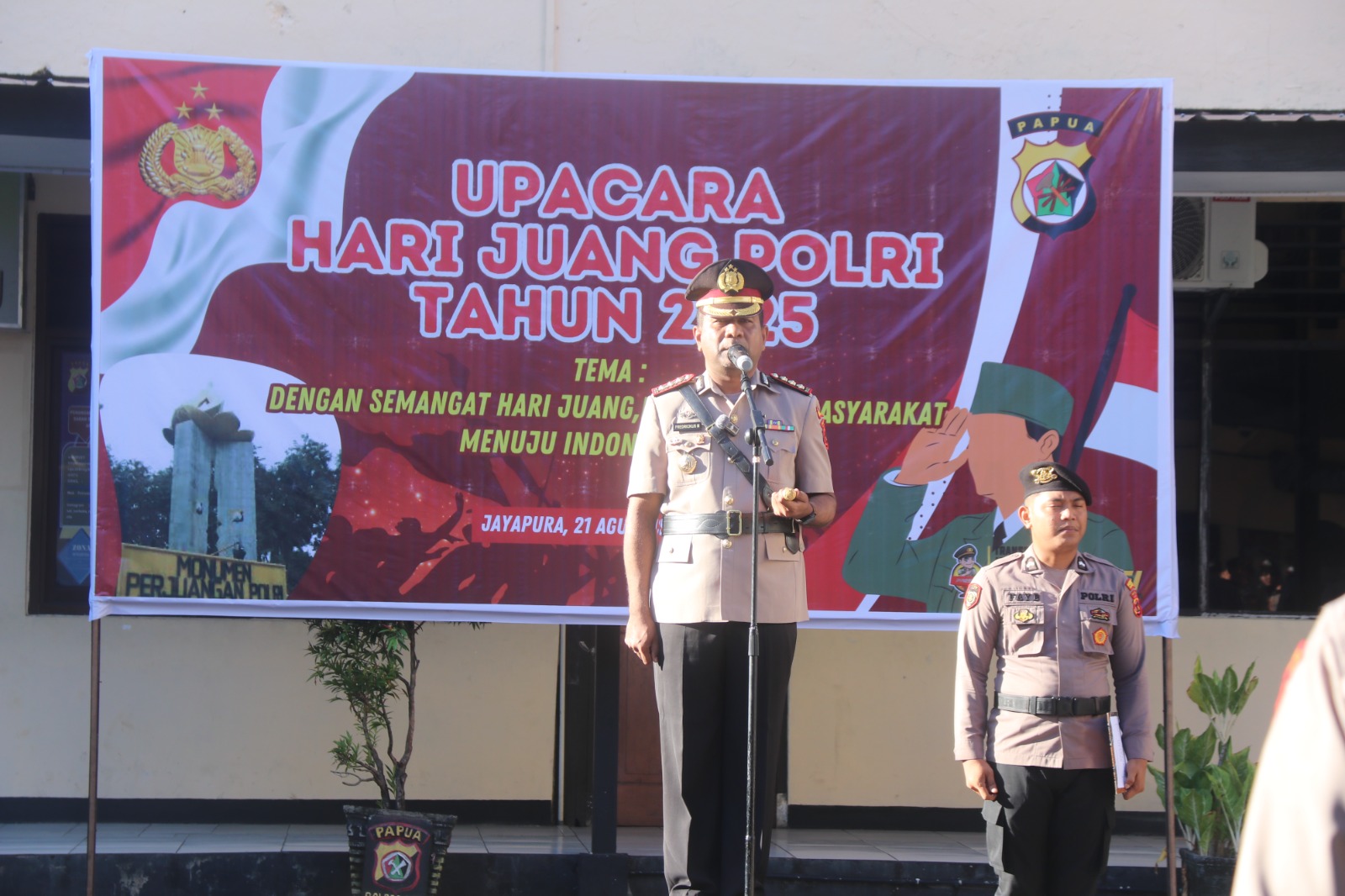 Bertindak selaku Inspektur Upacara, Kapolresta Jayapura Kota Kombes Pol Fredrickus W.A Maclarimboen, S.I.K., M.H., CPHR, memimpin langsung jalannya upacara dengan penuh semangat dan rasa hormat terhadap sejarah panjang pengabdian Kepolisian Republik Indonesia.