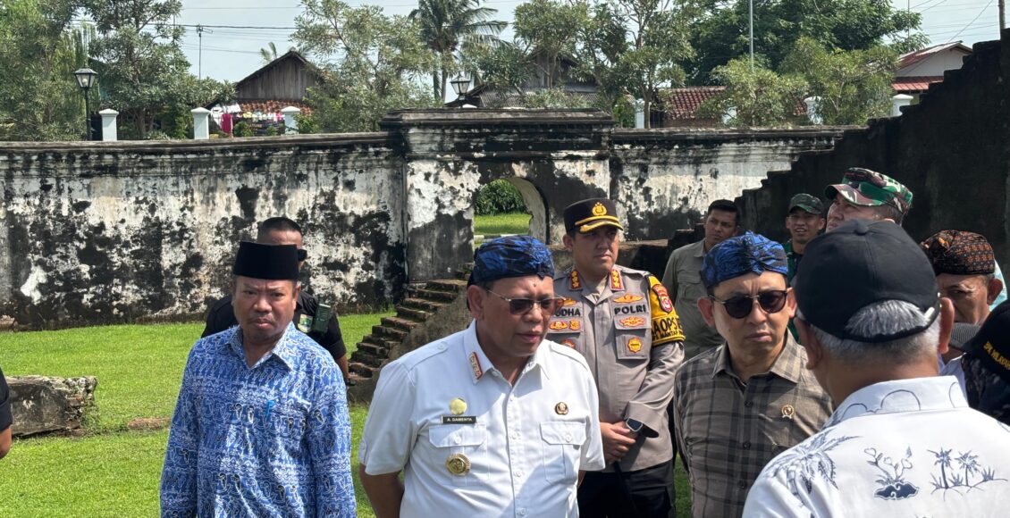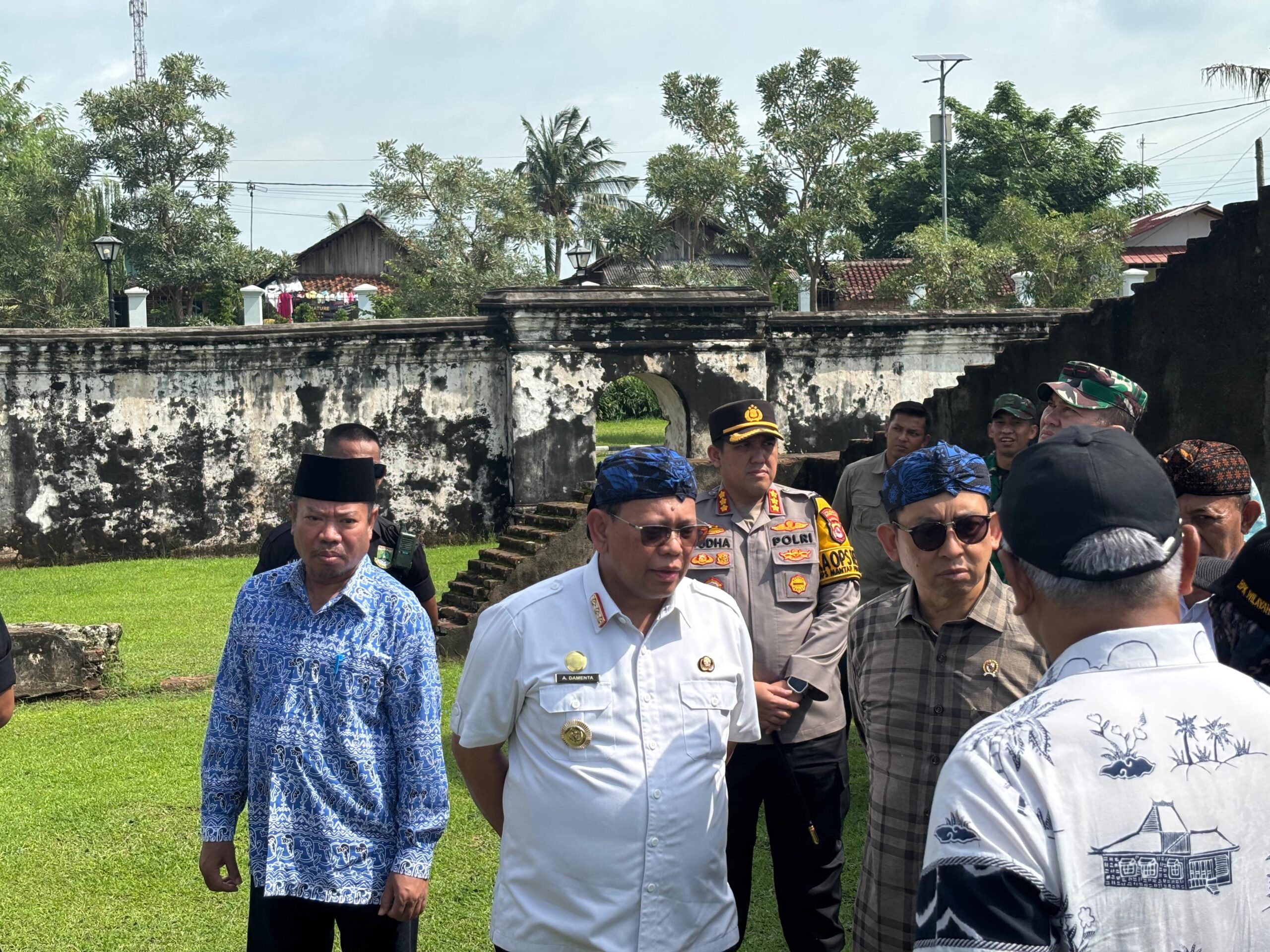 Pj. Gubernur Banten Ucok Abdulrauf Damenta, Kapolda Banten Irjen Pol. Suyudi Ario Seto, Danrem 064 My Brigjen TNI Fierman Sjafirial Dan Kapolresta Serkot Kombes Pol. Yudha Satria menyambut kedatangan Menteri Kebudyaan di lokasi Benteng Spelwijk bersama Forkopimda.
